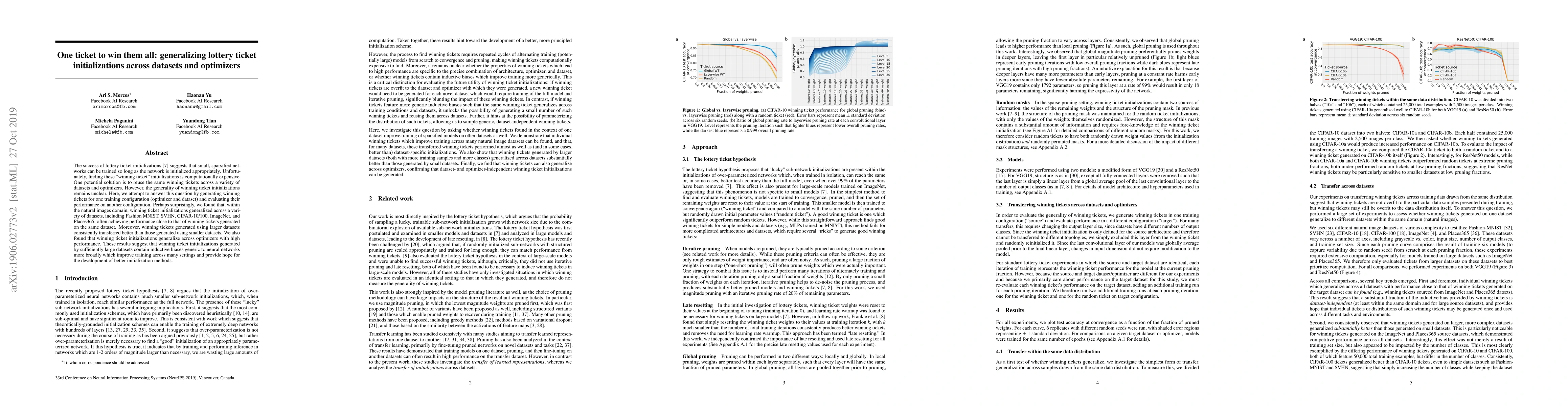 This paper investigates the generalization of lottery ticket initializations across different datasets and optimizers. It finds that winning tickets, once identified in one training configuration, often perform well when applied to other datasets and optimizers, suggesting that large datasets generate initializations with broad inductive biases.