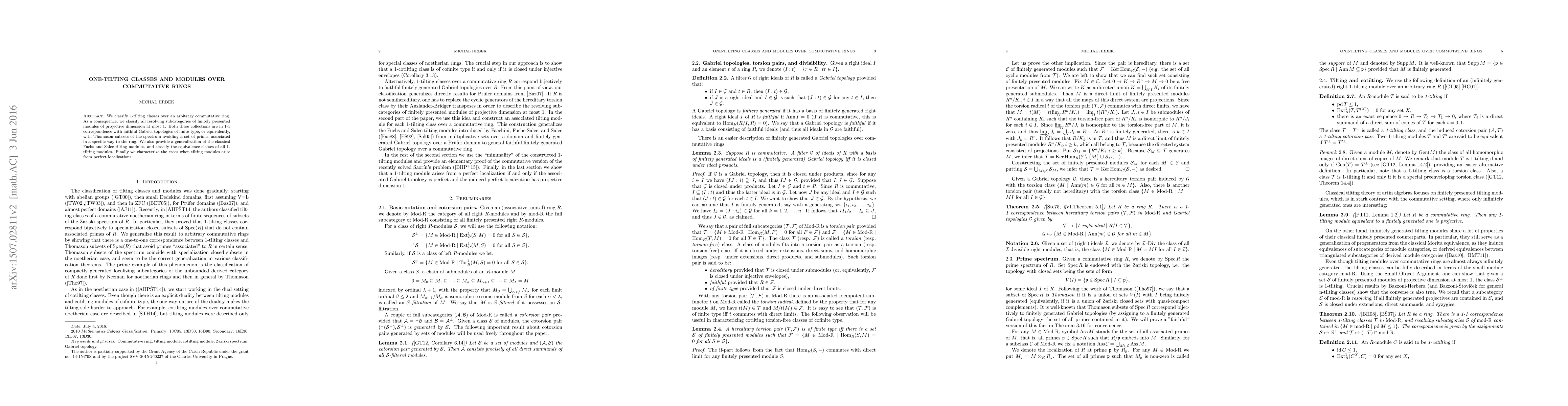 The paper classifies 1-tilting classes over commutative rings and identifies them with Gabriel topologies of finite type, establishing a 1-1 correspondence with resolving subcategories of modules of projective dimension at most 1. It also generalizes classical tilting modules and characterizes when tilting modules arise from perfect localizations.