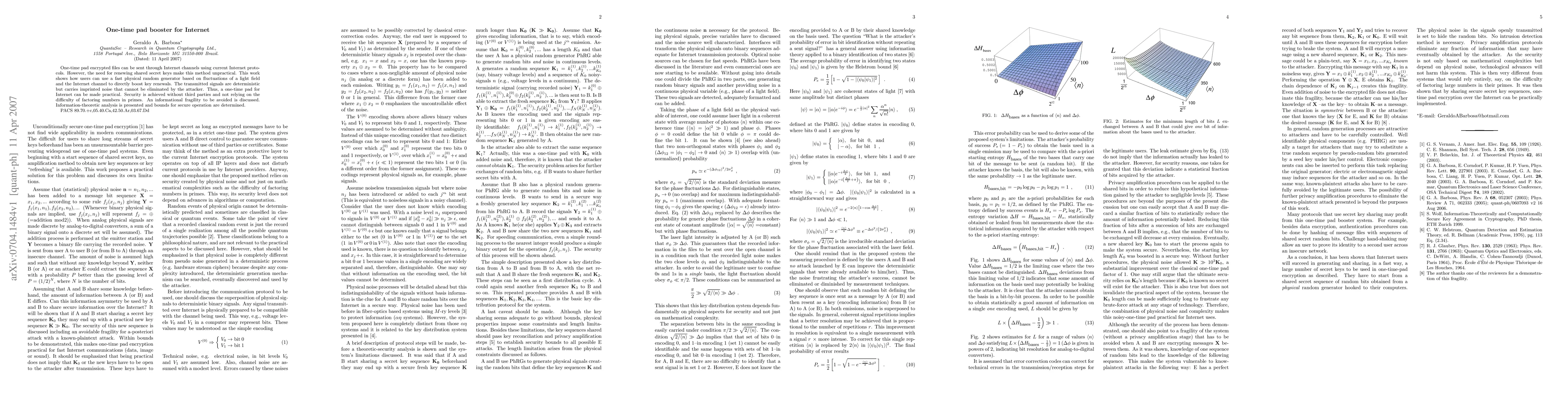 One-time pad encrypted files can be sent through Internet channels using current Internet protocols. However, the need for renewing shared secret keys make this method unpractical. This work shows how users can use a fast physical random generator based on fluctuations of a light field and the Internet channel to directly boost key renewals. The transmitted signals are deterministic but carries imprinted noise that cannot be eliminated by the attacker. Thus, a one-time pad for Internet can be made practical. Security is achieved without third parties and not relying on the difficulty of factoring numbers in primes. An informational fragility to be avoided is discussed. Information-theoretic analysis is presented and bounds for secure operation are determined.