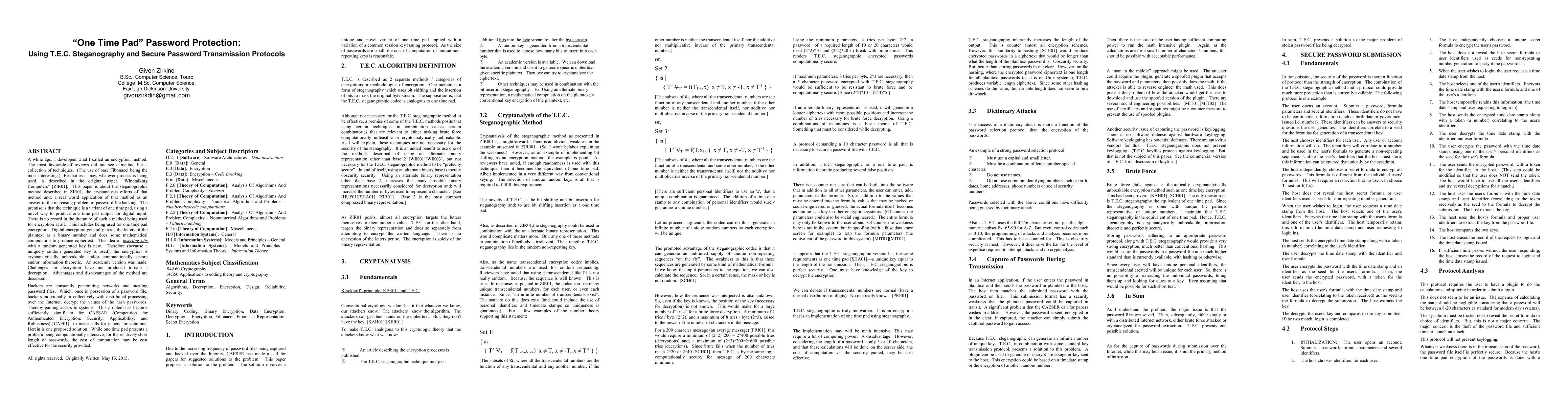 This paper proposes a novel one time pad encryption method using T.E.C. steganography and secure password transmission protocols to protect against password file hacking. The method, which inserts random bits with a unique key, is theoretically unbreakable and computationally secure, offering a robust solution to the growing problem of password theft.