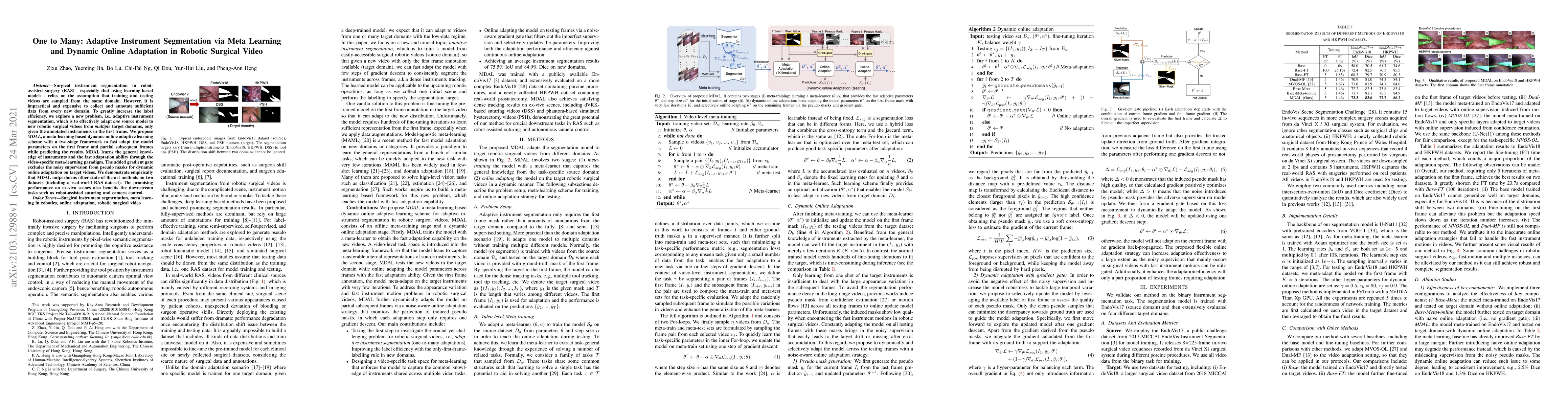 This research introduces MDAL, a meta-learning method for adapting robotic surgery instrument segmentation models to new, unseen video domains with just one annotated frame. MDAL outperforms existing methods on two datasets, including a real-world RAS dataset, and shows promise for improving downstream tasks like suturing and camera control.