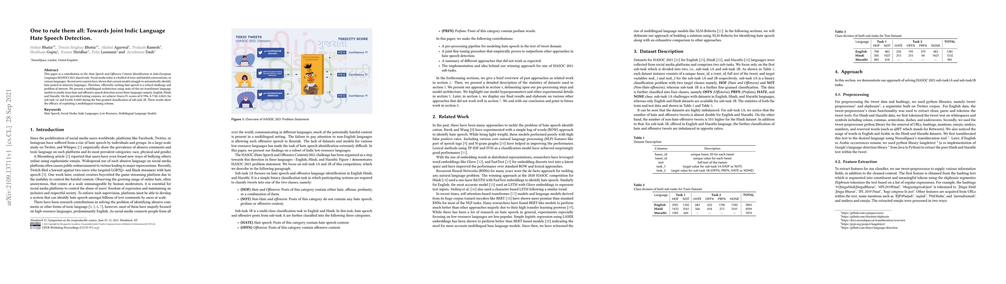 This paper is a contribution to the Hate Speech and Offensive Content Identification in Indo-European Languages (HASOC) 2021 shared task. Social media today is a hotbed of toxic and hateful conversations, in various languages. Recent news reports have shown that current models struggle to automatically identify hate posted in minority languages. Therefore, efficiently curbing hate speech is a critical challenge and problem of interest. We present a multilingual architecture using state-of-the-art transformer language models to jointly learn hate and offensive speech detection across three languages namely, English, Hindi, and Marathi. On the provided testing corpora, we achieve Macro F1 scores of 0.7996, 0.7748, 0.8651 for sub-task 1A and 0.6268, 0.5603 during the fine-grained classification of sub-task 1B. These results show the efficacy of exploiting a multilingual training scheme.