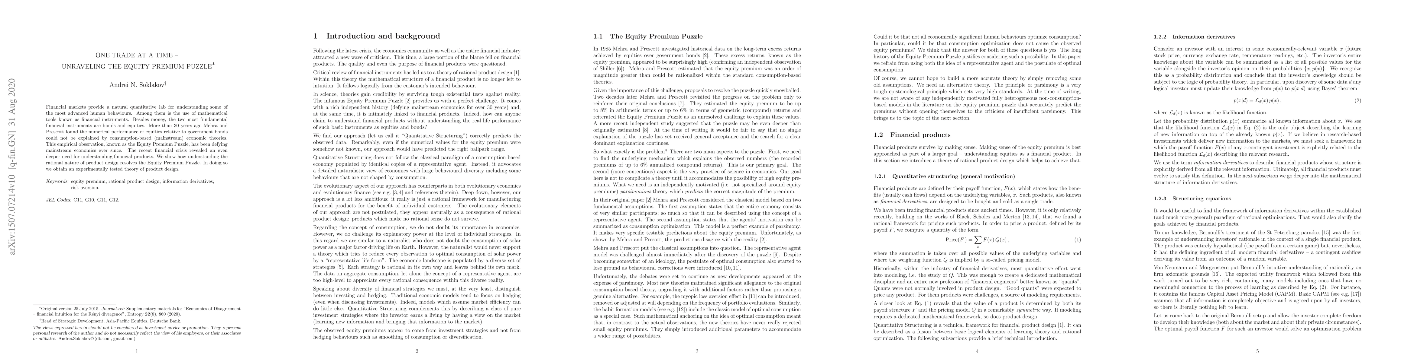 This paper resolves the Equity Premium Puzzle by demonstrating that the rational design of financial products, particularly bonds and equities, can explain the historically anomalous performance of equities relative to government bonds. The authors provide an experimentally tested theory of product design that aligns with observed financial market behaviors.