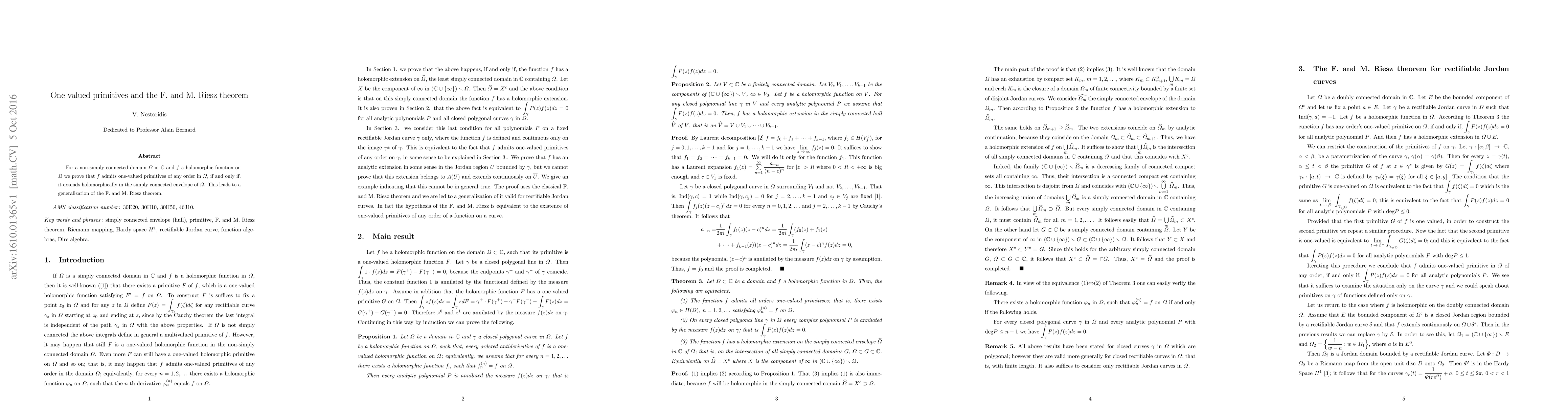 For a non-simply connected domain Omega in C and f a holomorphic function on Omega we prove that f admits one-valued primitives of any order in Omega, if and only if, it extends holomorphically in the simply connected envelope of Omega . This leads to a generalization of the F. and M. Riesz theorem.