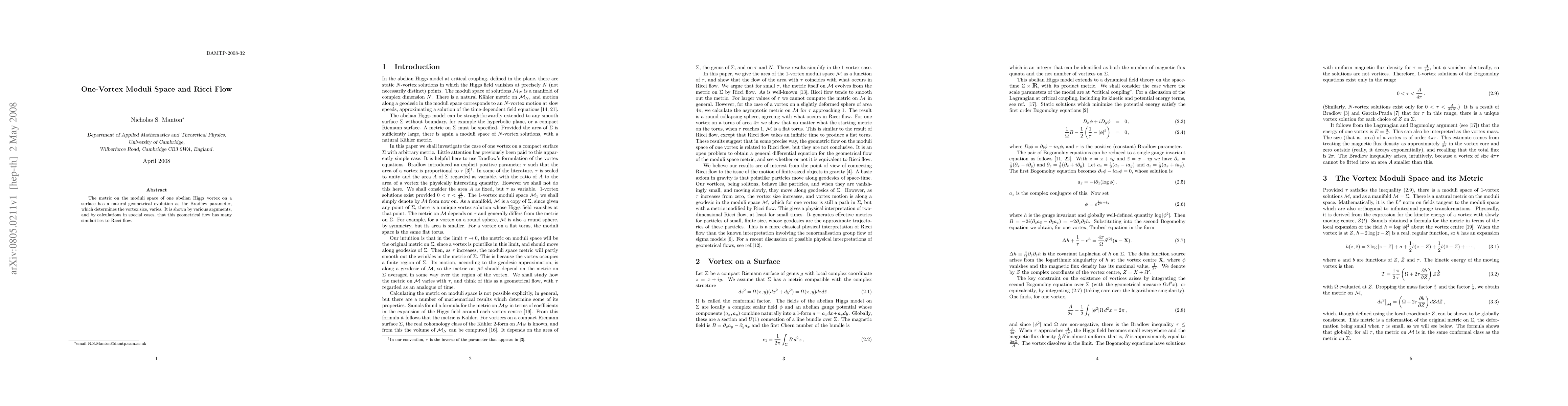 The research explores the metric on the moduli space of one abelian Higgs vortex on a surface, showing its geometric evolution as the Bradlow parameter varies, and comparing it to Ricci flow.