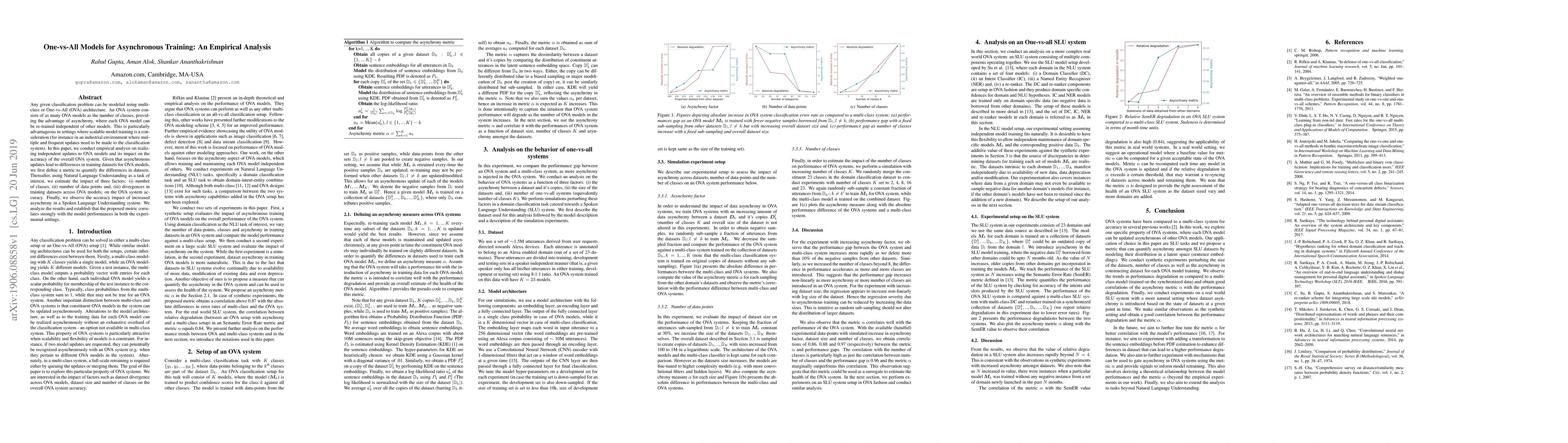 Any given classification problem can be modeled using multi-class or One-vs-All (OVA) architecture. An OVA system consists of as many OVA models as the number of classes, providing the advantage of asynchrony, where each OVA model can be re-trained independent of other models. This is particularly advantageous in settings where scalable model training is a consideration (for instance in an industrial environment where multiple and frequent updates need to be made to the classification system). In this paper, we conduct empirical analysis on realizing independent updates to OVA models and its impact on the accuracy of the overall OVA system. Given that asynchronous updates lead to differences in training datasets for OVA models, we first define a metric to quantify the differences in datasets. Thereafter, using Natural Language Understanding as a task of interest, we estimate the impact of three factors: (i) number of classes, (ii) number of data points and, (iii) divergences in training datasets across OVA models; on the OVA system accuracy. Finally, we observe the accuracy impact of increased asynchrony in a Spoken Language Understanding system. We analyze the results and establish that the proposed metric correlates strongly with the model performances in both the experimental settings.