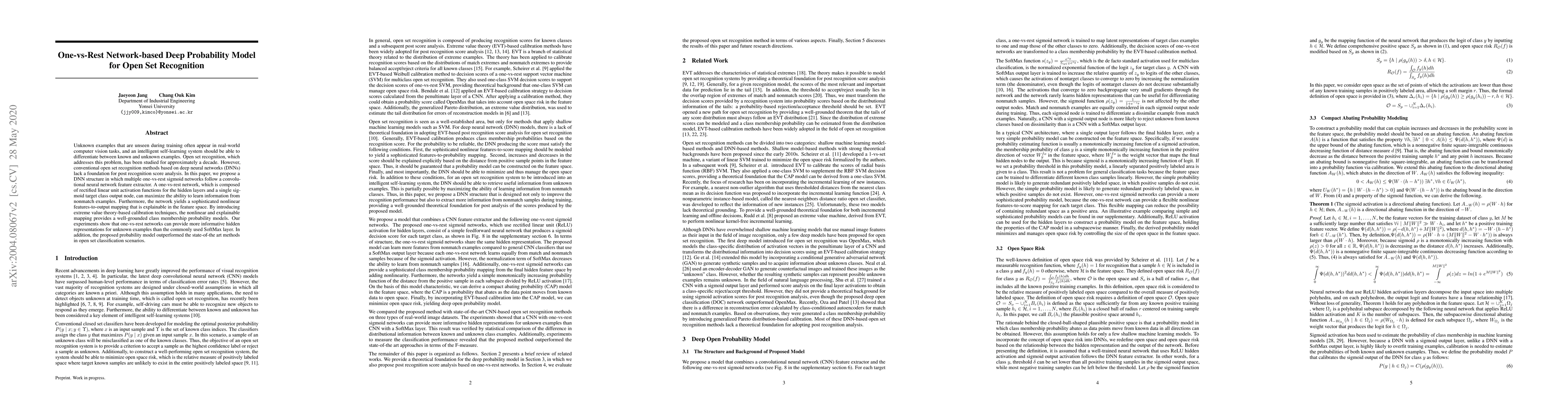 Unknown examples that are unseen during training often appear in real-world computer vision tasks, and an intelligent self-learning system should be able to differentiate between known and unknown examples. Open set recognition, which addresses this problem, has been studied for approximately a decade. However, conventional open set recognition methods based on deep neural networks (DNNs) lack a foundation for post recognition score analysis. In this paper, we propose a DNN structure in which multiple one-vs-rest sigmoid networks follow a convolutional neural network feature extractor. A one-vs-rest network, which is composed of rectified linear unit activation functions for the hidden layers and a single sigmoid target class output node, can maximize the ability to learn information from nonmatch examples. Furthermore, the network yields a sophisticated nonlinear features-to-output mapping that is explainable in the feature space. By introducing extreme value theory-based calibration techniques, the nonlinear and explainable mapping provides a well-grounded class membership probability models. Our experiments show that one-vs-rest networks can provide more informative hidden representations for unknown examples than the commonly used SoftMax layer. In addition, the proposed probability model outperformed the state-of-the art methods in open set classification scenarios.