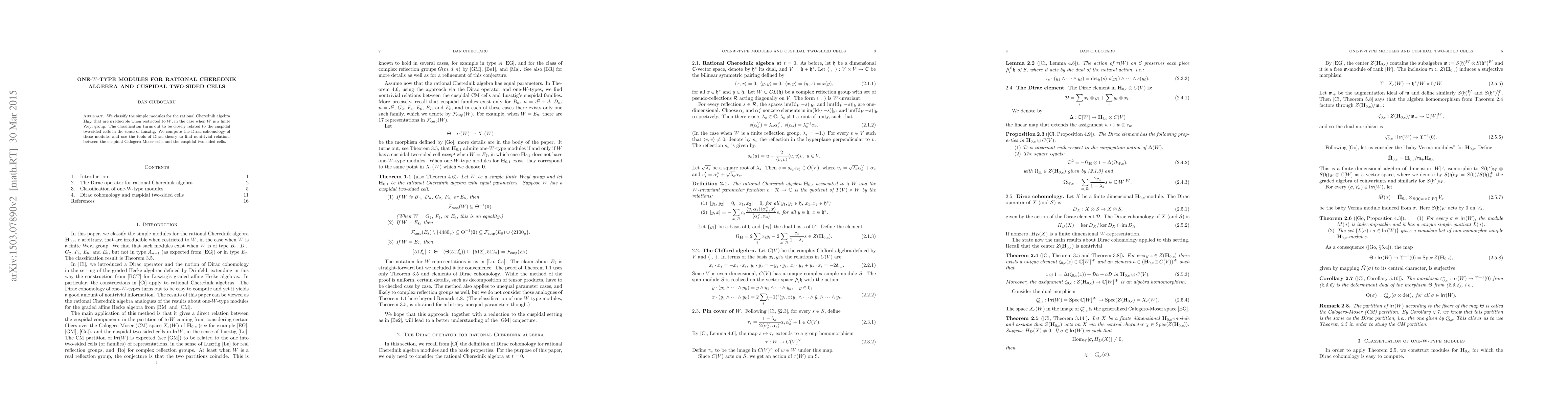 This paper classifies simple modules of rational Cherednik algebras restricted to finite Weyl groups, revealing a connection to cuspidal two-sided cells. The study also computes Dirac cohomology and identifies nontrivial relations between cuspidal Calogero-Moser cells and cuspidal two-sided cells using Dirac theory.