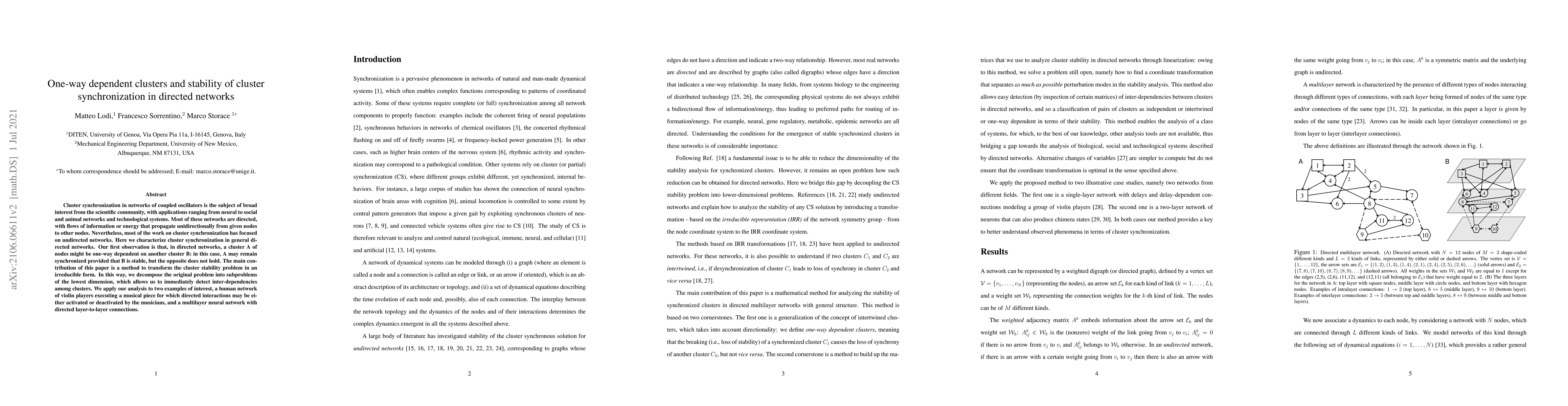 Cluster synchronization in networks of coupled oscillators is the subject of broad interest from the scientific community, with applications ranging from neural to social and animal networks and technological systems. Most of these networks are directed, with flows of information or energy that propagate unidirectionally from given nodes to other nodes. Nevertheless, most of the work on cluster synchronization has focused on undirected networks. Here we characterize cluster synchronization in general directed networks. Our first observation is that, in directed networks, a cluster A of nodes might be one-way dependent on another cluster B: in this case, A may remain synchronized provided that B is stable, but the opposite does not hold. The main contribution of this paper is a method to transform the cluster stability problem in an irreducible form. In this way, we decompose the original problem into subproblems of the lowest dimension, which allows us to immediately detect inter-dependencies among clusters. We apply our analysis to two examples of interest, a human network of violin players executing a musical piece for which directed interactions may be either activated or deactivated by the musicians, and a multilayer neural network with directed layer-to-layer connections.