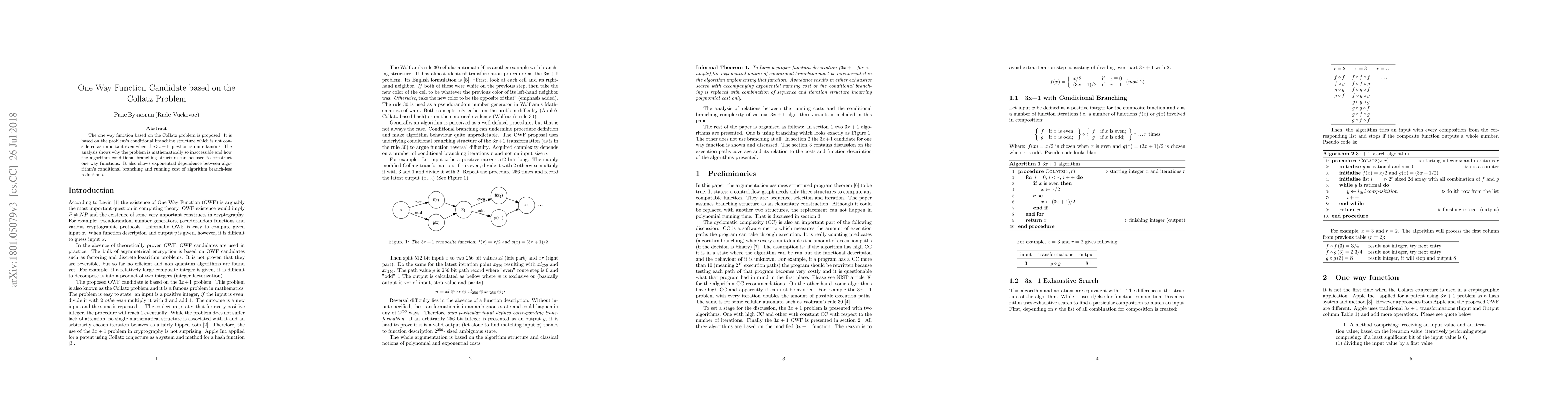 The one way function based on the Collatz problem is proposed. It is based on the problem's conditional branching structure which is not considered as important even the 3x+1 question is quite famous. The analysis shows why the problem is mathematically so inaccessible and how the algorithm conditional branching structure can be used to construct one way functions. It also shows exponential dependence between algorithm's conditional branching and running cost of algorithm branch-less reductions.