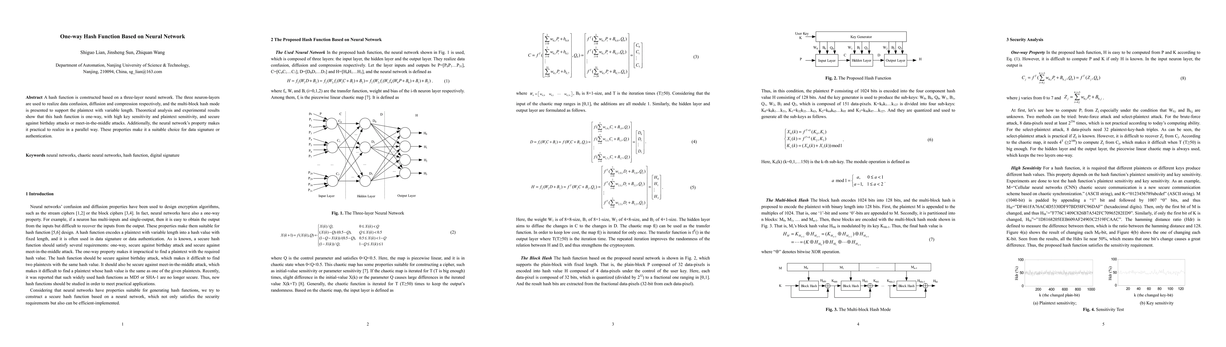 This paper proposes a one-way hash function based on a three-layer neural network, achieving data confusion, diffusion, and compression. The multi-block hash mode supports variable-length plaintext, and it is shown to be secure against birthday and meet-in-the-middle attacks, making it practical for data signature and authentication.