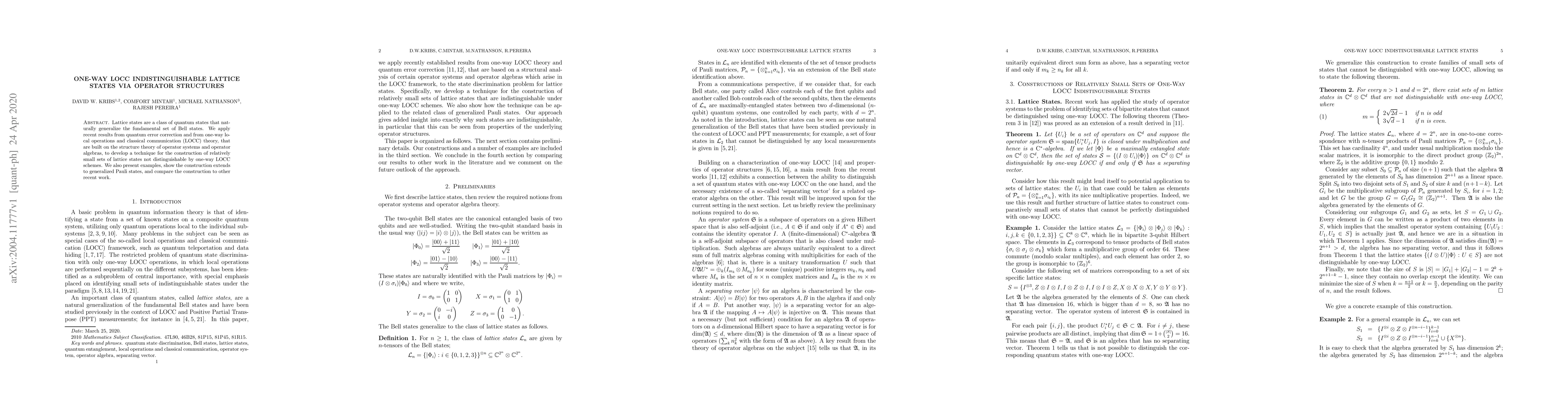 Lattice states are a class of quantum states that naturally generalize the fundamental set of Bell states. We apply recent results from quantum error correction and from one-way local operations and classical communication (LOCC) theory, that are built on the structure theory of operator systems and operator algebras, to develop a technique for the construction of relatively small sets of lattice states not distinguishable by one-way LOCC schemes. We also present examples, show the construction extends to generalized Pauli states, and compare the construction to other recent work.