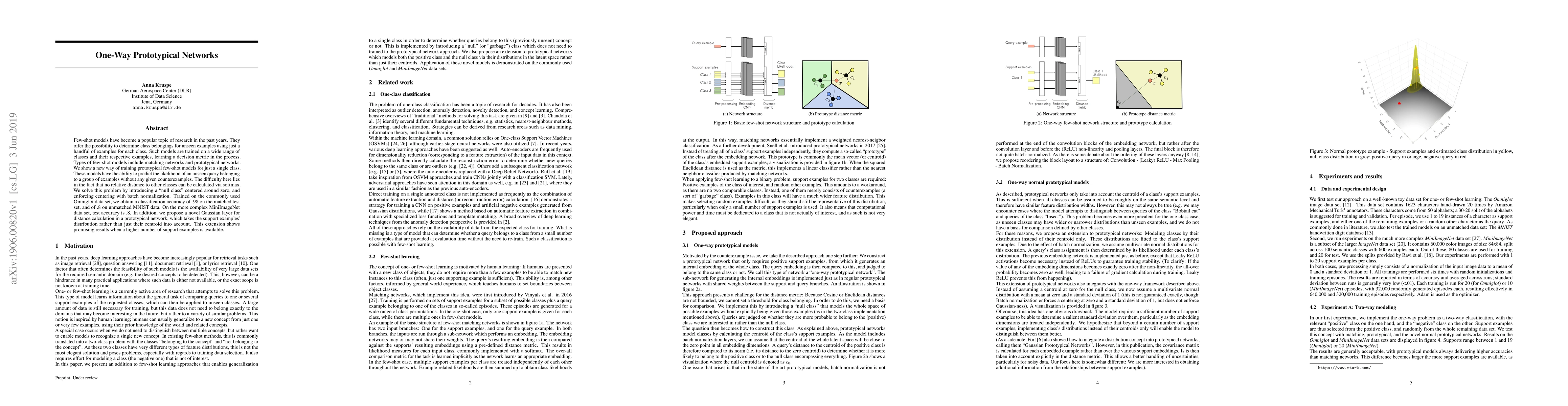 A new method for training one-way prototypical networks, a type of few-shot model, is introduced to predict the likelihood of unseen examples belonging to a class without given counterexamples, achieving high accuracy on various datasets.