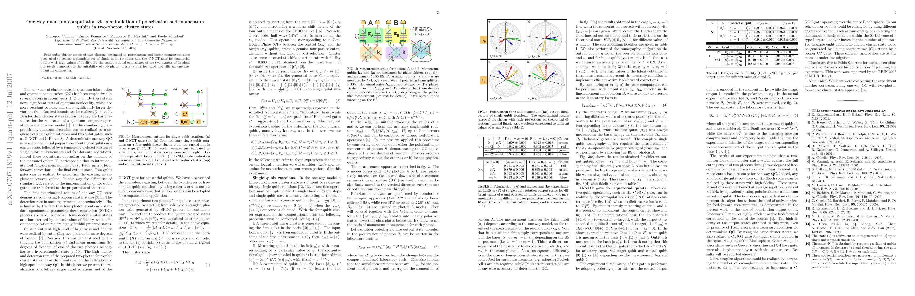This paper demonstrates the use of two-photon cluster states for one-way quantum computation, achieving high fidelity single qubit rotations and C-NOT gate operations via polarization and momentum qubits. The results show the potential of two-photon cluster states for efficient quantum computing.