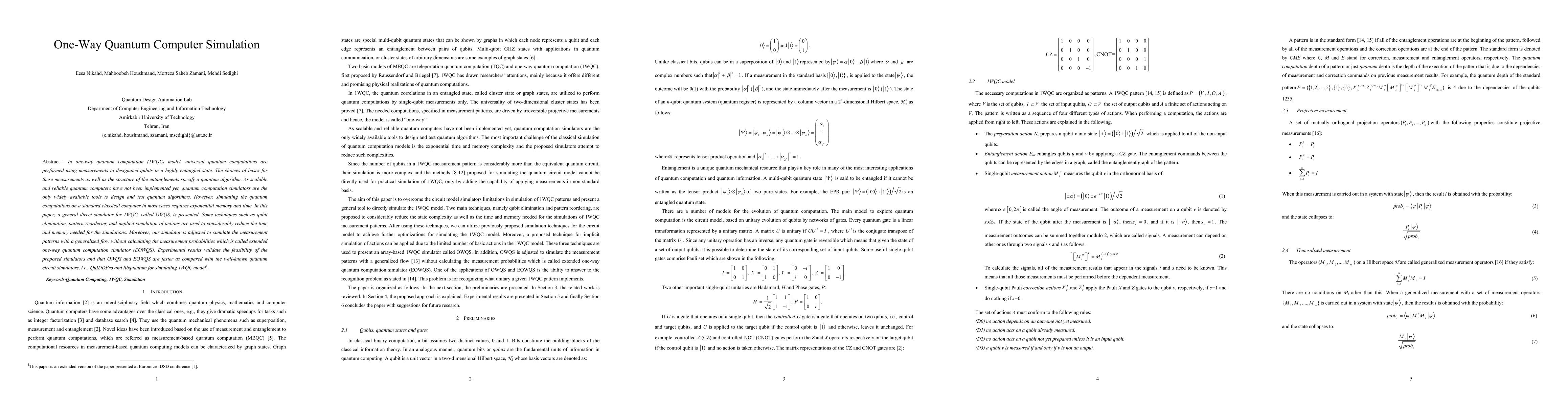 This paper introduces a direct simulator for one-way quantum computation (1WQC) called OWQS, which employs techniques like qubit elimination and implicit simulation to reduce memory and time. An extended version, EOWQS, simulates measurement patterns without calculating probabilities, demonstrating faster performance compared to existing simulators.