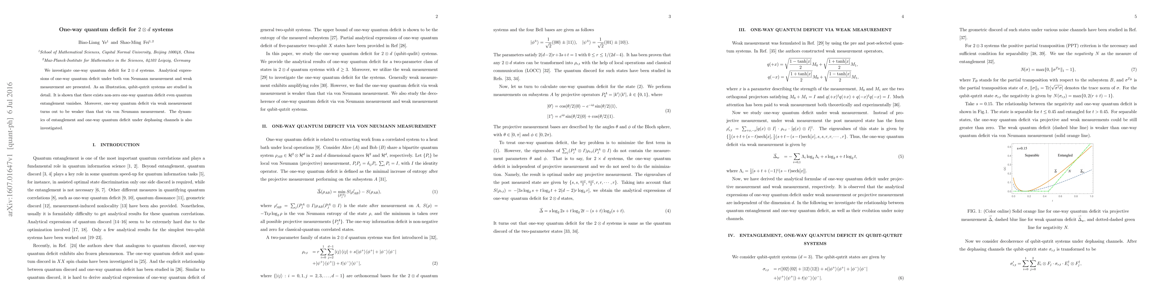 We investigate one-way quantum deficit for $2\otimes d$ systems. Analytical expressions of one-way quantum deficit under both von Neumann measurement and weak measurement are presented. As an illustration, qubit-qutrit systems are studied in detail. It is shown that there exists non-zero one-way quantum deficit even quantum entanglement vanishes. Moreover, one-way quantum deficit via weak measurement turns out to be weaker than that via von Neumann measurement. The dynamics of entanglement and one-way quantum deficit under dephasing channels is also investigated.