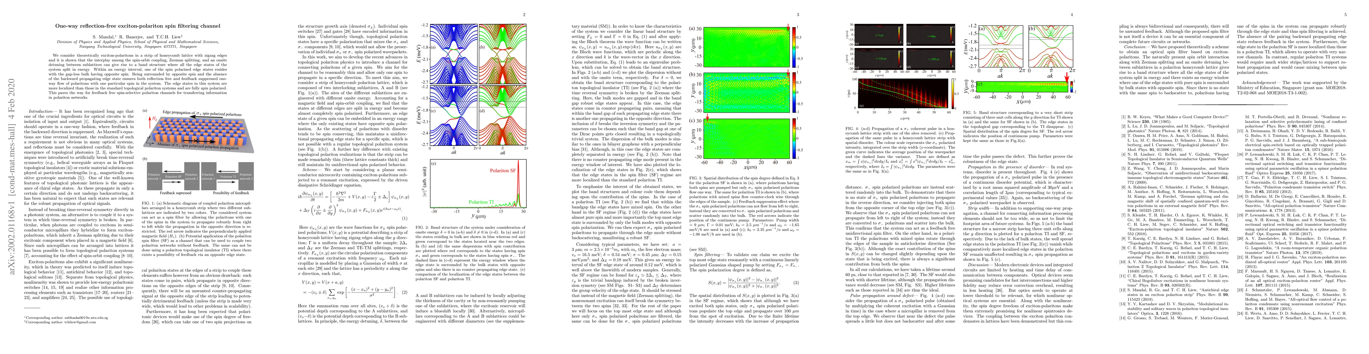 This paper theoretically demonstrates a one-way reflection-free exciton-polariton spin filtering channel in a honeycomb lattice with zigzag edges, showing that spin-orbit coupling and Zeeman splitting enable fully spin-polarized, localized edge states, enabling feedback-free spin-selective polariton information transfer.