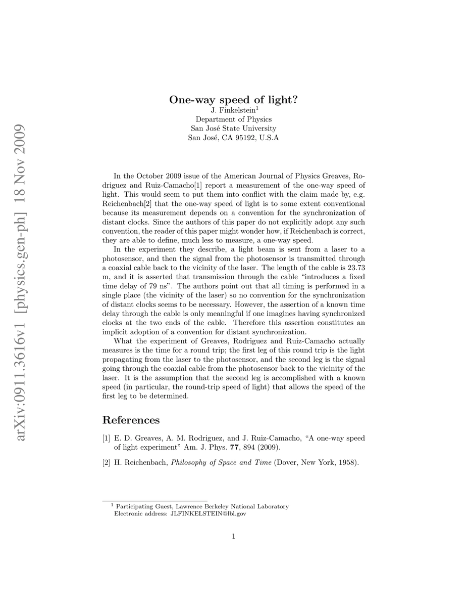 This paper critiques a previous study that measured the one-way speed of light, raising questions about the methodology and interpretation of the results. The author suggests alternative considerations that may affect the findings.