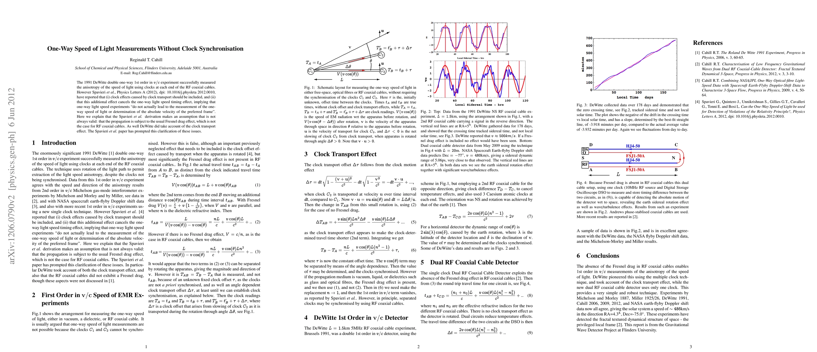 The 1991 DeWitte double one-way 1st order in v/c experiment successfully measured the anisotropy of the speed of light using clocks at each end of the RF coaxial cables. However Spavieri et al., Physics Letters A (2012), doi: 10.1016/j.physleta_2012.0010, have reported that (i) clock effects caused by clock transport should be included, and (ii) that this additional effect cancels the one-way light speed timing effect, implying that one-way light speed experiments "do not actually lead to the measurement of the one-way speed of light or determination of the absolute velocity of the preferred frame". Here we explain that the Spavieri et al. derivation makes an assumption that is not always valid: that the propagation is subject to the usual Fresnel drag effect, which is not the case for RF coaxial cables. As well DeWitte did take account of the clock transport effect. The Spavieri et al. paper has prompted this clarification of these issues.