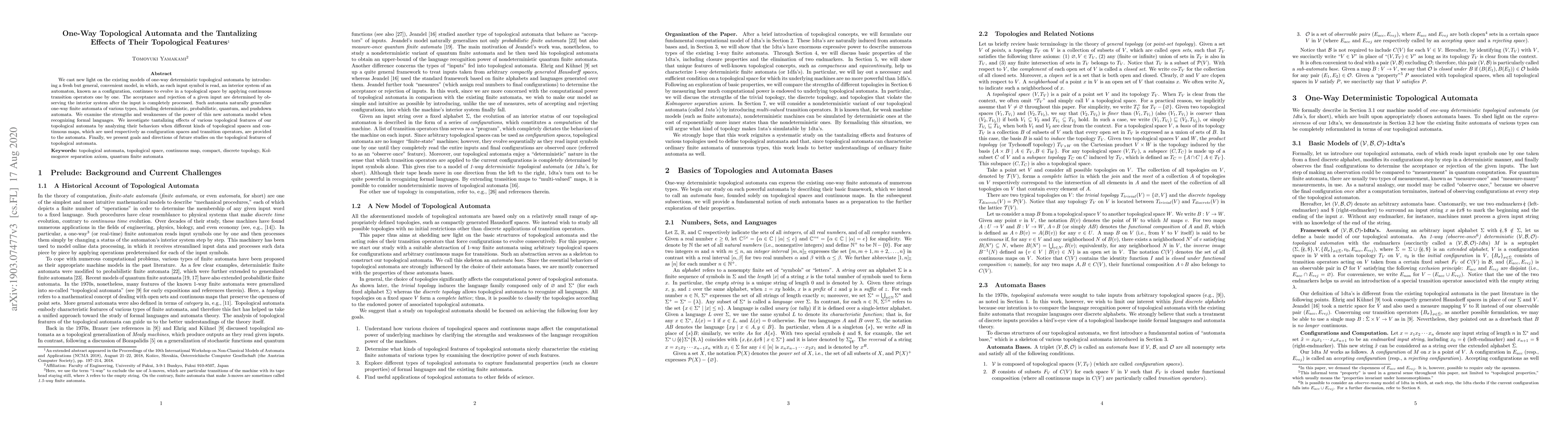 We cast new light on the existing models of one-way deterministic topological automata by introducing a fresh but general, convenient model, in which, as each input symbol is read, an interior system of an automaton, known as a configuration, continues to evolve in a topological space by applying continuous transition operators one by one. The acceptance and rejection of a given input are determined by observing the interior system after the input is completely processed. Such automata naturally generalize one-way finite automata of various types, including deterministic, probabilistic, quantum, and pushdown automata. We examine the strengths and weaknesses of the power of this new automata model when recognizing formal languages. We investigate tantalizing effects of various topological features of our topological automata by analyzing their behaviors when different kinds of topological spaces and continuous maps, which are used respectively as configuration spaces and transition operators, are provided to the automata. Finally, we present goals and directions of future studies on the topological features of topological automata.