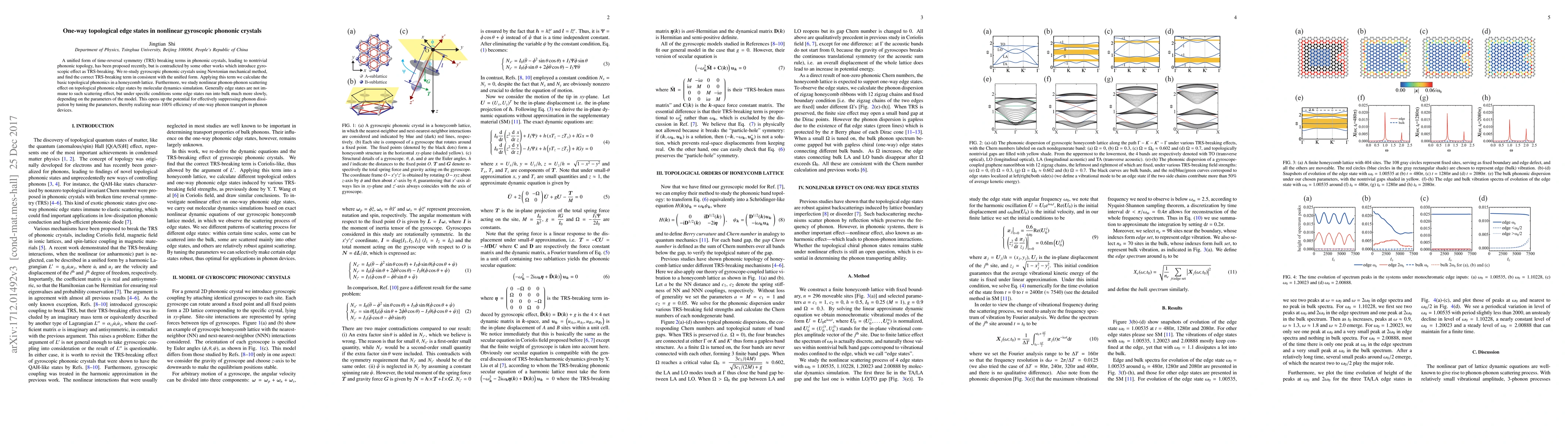 A unified form of time-reversal symmetry (TRS) breaking terms in phononic crystals, leading to nontrivial phononic topology, has been proposed recently, but is contradicted by some other works which introduce gyroscopic effect as TRS-breaking. We re-study gyroscopic phononic crystals using Newtonian mechanical method, and find the correct TRS-breaking term in consistent with the unified form. Applying this term we calculate the basic topological phononics in a honeycomb lattice. Furthermore, we study nonlinear phonon-phonon scattering effect on topological phononic edge states by molecular dynamics simulation. Generally edge states are not immune to such scattering effect, but under specific conditions some edge states run into bulk much more slowly, depending on the parameters of the model. This opens up the potential for effectively suppressing phonon dissipation by tuning the parameters, thereby realizing near-100% efficiency of one-way phonon transport in phonon devices.