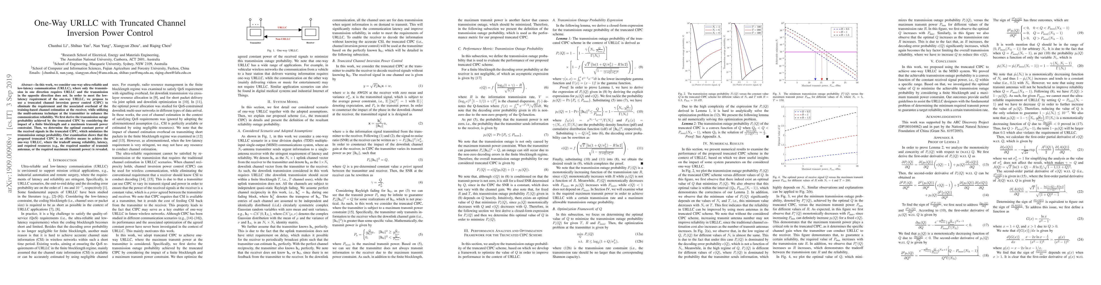 In this work, we consider one-way ultra-reliable and low-latency communication (URLLC), where only the transmission in one direction requires URLLC and the transmission in the opposite direction does not. In order to meet the low-latency requirement of the one-way URLLC, we propose to use a truncated channel inversion power control (CIPC) to eliminate the requirement and the associated overhead of the training-based channel estimation at the receiver, while utilizing the multi-antenna technique at the transmitter to enhance the communication reliability. We first derive the transmission outage probability achieved by the truncated CIPC by considering the impact of a finite blocklength and a maximum transmit power constraint. Then, we determine the optimal constant power of the received signals in the truncated CIPC, which minimizes the transmission outage probability. Our examination shows that the proposed truncated CIPC is an effective means to achieve the one-way URLLC, where the tradeoff among reliability, latency, and required resources (e.g., the required number of transmit antennas, or the required maximum transmit power) is revealed.