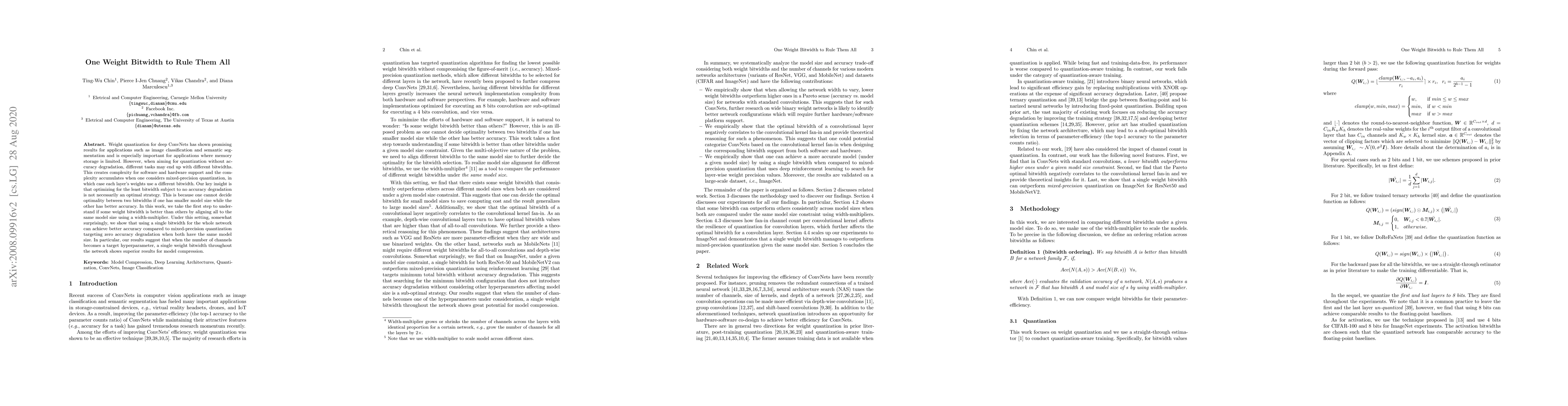 A new approach suggests using a single weight bitwidth throughout a neural network can achieve better accuracy than mixed-precision quantization for model compression, especially when the number of channels is limited.