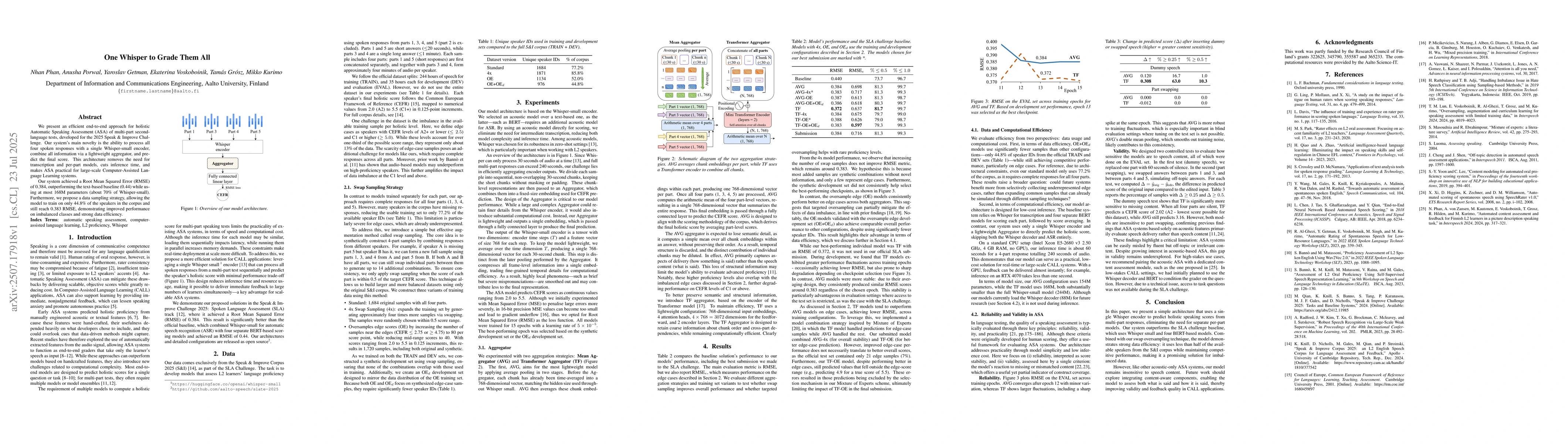 We present an efficient end-to-end approach for holistic Automatic Speaking Assessment (ASA) of multi-part second-language tests, developed for the 2025 Speak & Improve Challenge. Our system's main novelty is the ability to process all four spoken responses with a single Whisper-small encoder, combine all information via a lightweight aggregator, and predict the final score. This architecture removes the need for transcription and per-part models, cuts inference time, and makes ASA practical for large-scale Computer-Assisted Language Learning systems. Our system achieved a Root Mean Squared Error (RMSE) of 0.384, outperforming the text-based baseline (0.44) while using at most 168M parameters (about 70% of Whisper-small). Furthermore, we propose a data sampling strategy, allowing the model to train on only 44.8% of the speakers in the corpus and still reach 0.383 RMSE, demonstrating improved performance on imbalanced classes and strong data efficiency.
