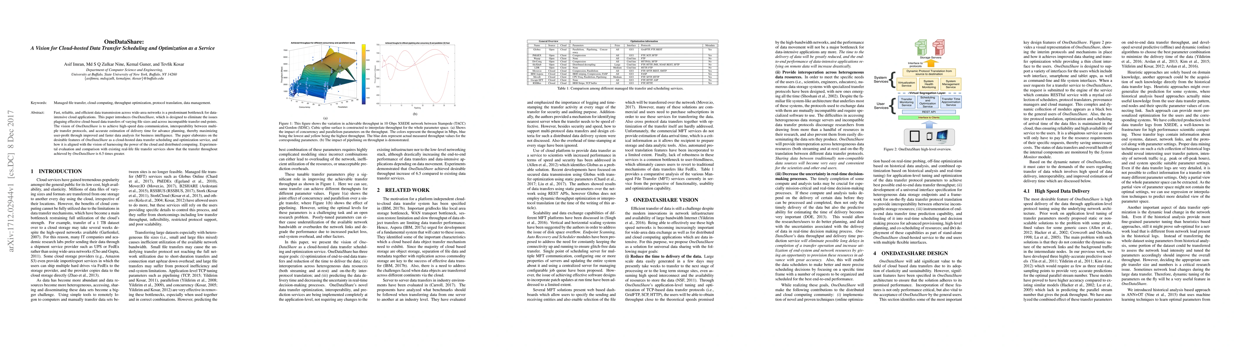 OneDataShare aims to optimize cloud-hosted data transfer scheduling and enhance data transmission efficiency across wide-area networks. Experimental results demonstrate a 6.5-fold improvement in transfer throughput compared to existing services.