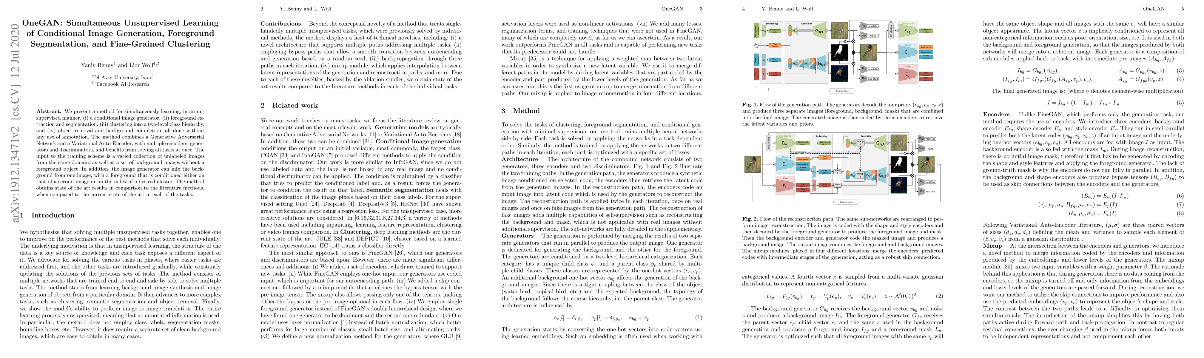 Researchers present a novel method called OneGAN that learns multiple tasks simultaneously without annotations, achieving state-of-the-art results in conditional image generation, foreground segmentation, fine-grained clustering, object removal, and background completion.