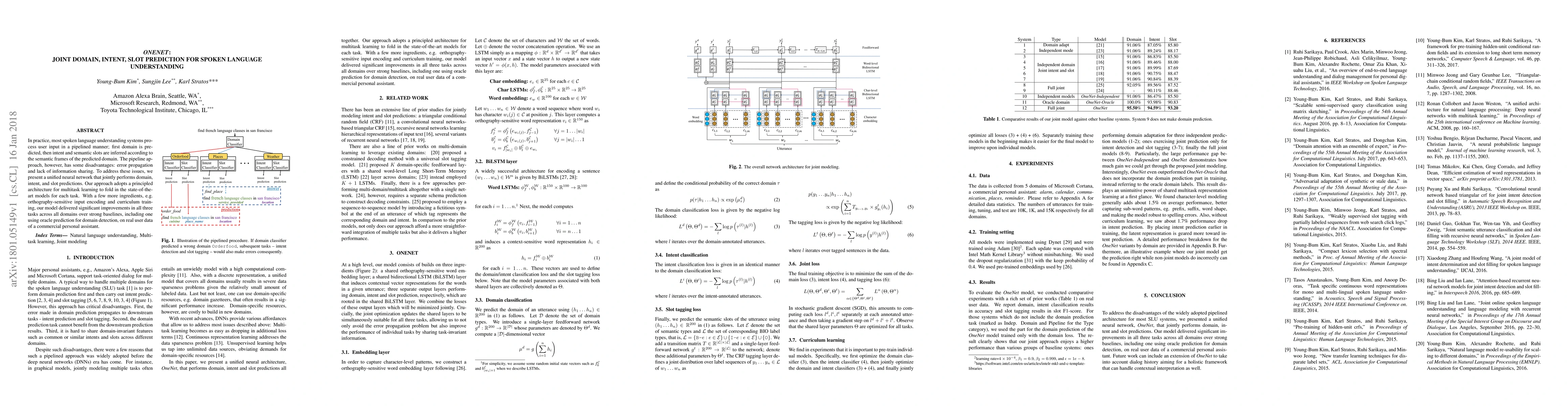 The paper introduces OneNet, a unified neural network for joint domain, intent, and slot prediction in spoken language understanding, aiming to mitigate error propagation and enhance information sharing. The model achieves significant improvements over baselines by employing multitask learning and advanced techniques like orthography-sensitive input encoding and curriculum training.