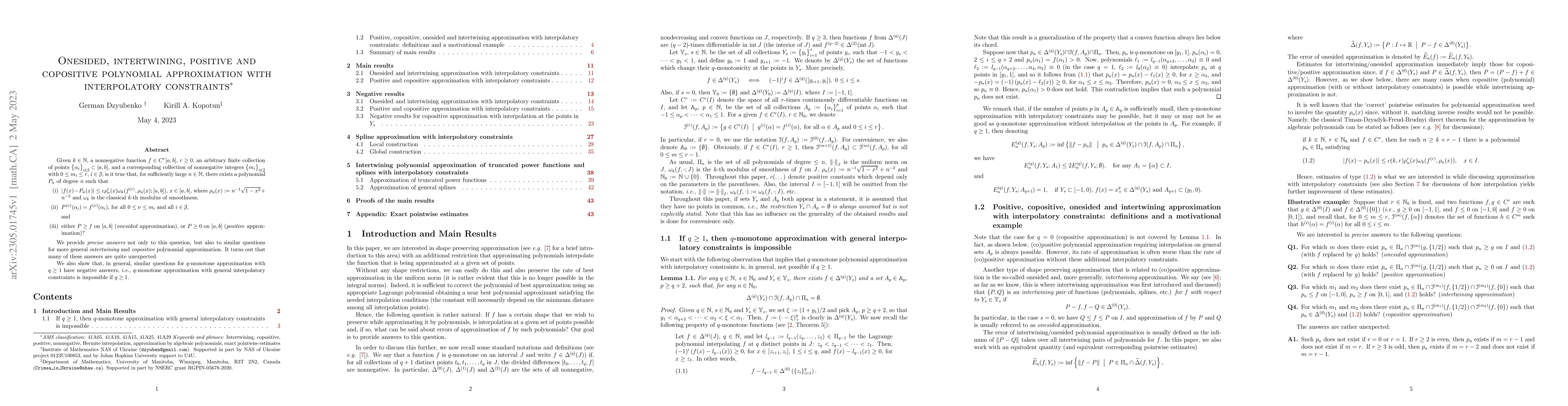 Given $k\in N$, a nonnegative function $f\in C^r[a,b]$, $r\ge 0$, an arbitrary finite collection of points $\big\{\alpha_i\big\}_{i\in J} \subset [a,b]$, and a corresponding collection of nonnegative integers $\big\{m_i\big\}_{i\in J}$ with $0\le m_i \le r$, $i\in J$, is it true that, for sufficiently large $n\in N$, there exists a polynomial $P_n$ of degree $n$ such that (i) $|f(x)-P_n(x)| \le c \rho_n^r(x) \omega_k(f^{(r)}, \rho_n(x); [a,b])$, $x\in [a,b]$, where $\rho_n (x):= n^{-1} \sqrt{1-x^2} +n^{-2}$ and $\omega_k$ is the classical $k$-th modulus of smoothness, (ii) $P^{(\nu)}(\alpha_i)=f^{(\nu)}(\alpha_i)$, for all $0\le \nu \le m_i$ and all $i\in J$, and (iii) either $P \ge f$ on $[a,b]$ (\emph{onesided} approximation), or $P \ge 0$ on $[a,b]$ (\emph{positive} approximation)? We provide {\em precise answers} not only to this question, but also to similar questions for more general {\em intertwining} and {\em copositive} polynomial approximation. It turns out that many of these answers are quite unexpected. We also show that, in general, similar questions for $q$-monotone approximation with $q\ge 1$ have negative answers, i.e., $q$-monotone approximation with general interpolatory constraints is impossible if $q\ge 1$.