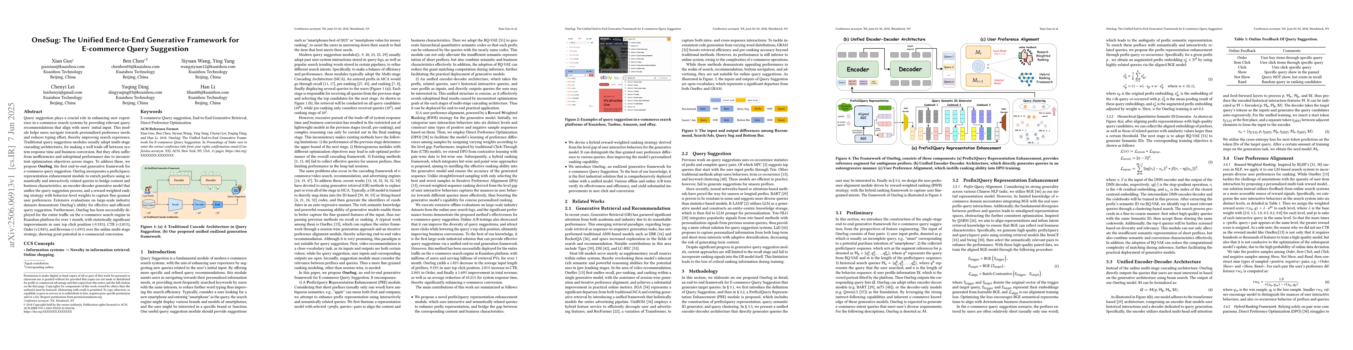OneSug is an end-to-end generative framework for e-commerce query suggestion that improves search experience by providing personalized recommendations and reduces typing effort. It achieves statistically significant improvements in user engagement metrics.