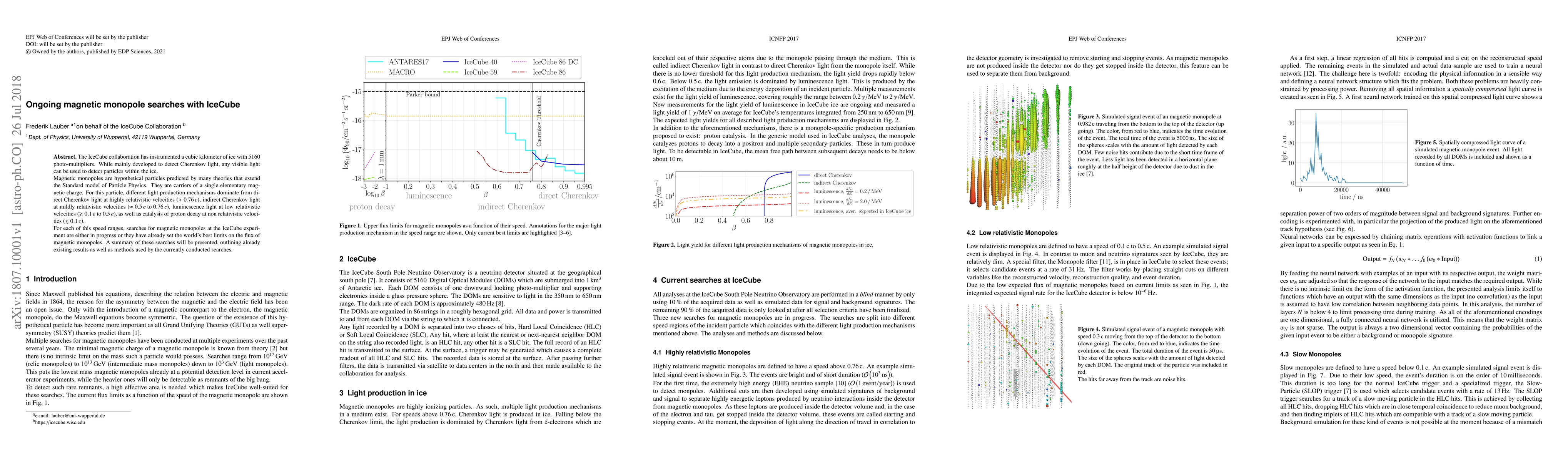 The IceCube collaboration uses its extensive photo-multiplier array to search for magnetic monopoles, employing various light detection mechanisms across different particle velocities. The experiment has set world-leading limits on monopole flux and continues to explore these exotic particles.