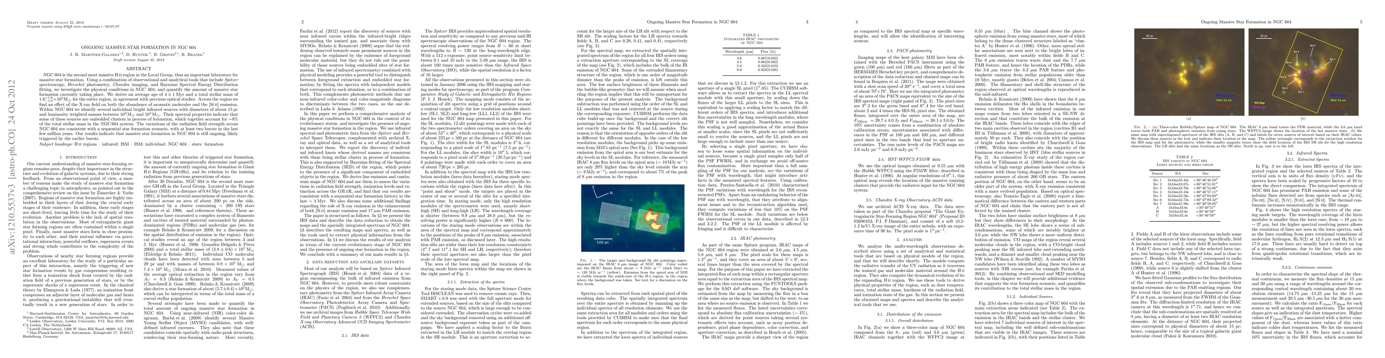 NGC 604 is the second most massive H II region in the Local Group, thus an important laboratory for massive star formation. Using a combination of observational and analytical tools that include Spitzer spectroscopy, Herschel photometry, Chandra imaging, and Bayesian Spectral Energy Distribution fitting, we investigate the physical conditions in NGC 604, and quantify the amount of massive star formation currently taking place. We derive an average age of 4 +/- 1 Myr and a total stellar mass of 1.6 (+1.6)(-1.0) x 10^5 M_sun for the entire region, in agreement with previous optical studies. Across the region we find an effect of the X-ray field on both the abundance of aromatic molecules and the [Si II] emission. Within NGC 604 we identify several individual bright infrared sources with diameters of about 15 pc and luminosity weighted masses between 10^3 M_sun and 10^4 M_sun. Their spectral properties indicate that some of these sources are embedded clusters in process of formation, which together account for ~8% of the total stellar mass in the NGC 604 system. The variations of the radiation field strength across NGC 604 are consistent with a sequential star formation scenario, with at least two bursts in the last few million years. Our results indicate that massive star formation in NGC 604 is still ongoing, likely triggered by the earlier bursts.