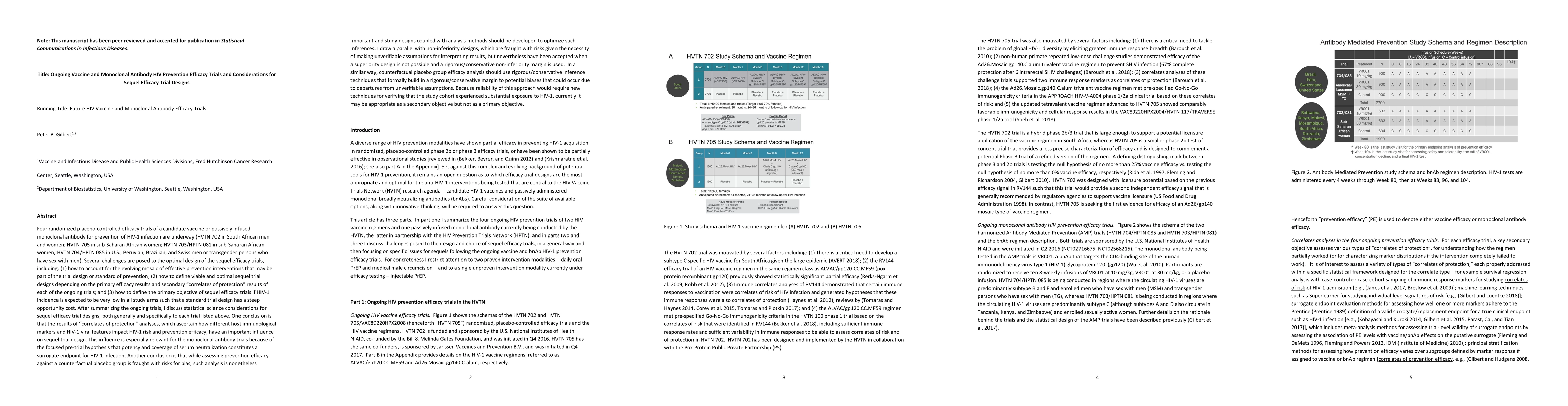 This paper discusses ongoing HIV-1 prevention trials involving vaccines and monoclonal antibodies, highlighting four key trials across diverse populations. It also addresses challenges in designing subsequent efficacy trials, including evolving prevention strategies, defining optimal trial designs based on ongoing trial results, and determining primary objectives when HIV-1 incidence is low. The paper emphasizes the importance of 'correlates of protection' analyses in shaping these future trial designs, particularly for monoclonal antibody trials.