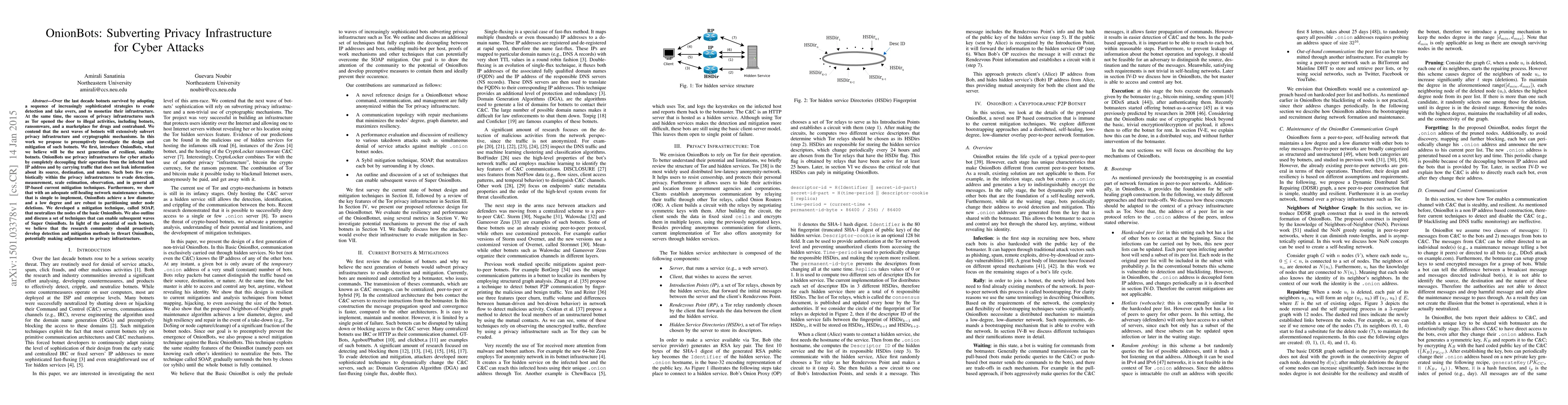 This paper introduces OnionBots, a next-generation botnet that leverages privacy infrastructures like Tor to evade detection and operate stealthily. It proposes a mitigation technique called SOAP to neutralize basic OnionBots and calls for proactive research to develop defenses against future, more advanced Super OnionBots.