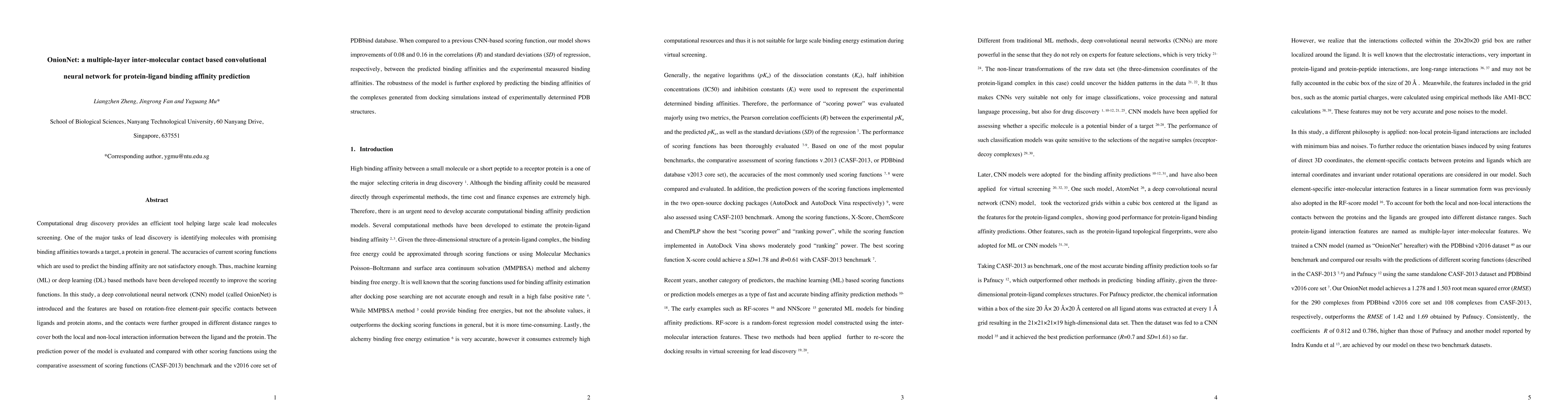 OnionNet is a deep convolutional neural network designed to predict protein-ligand binding affinities using inter-molecular contact features. It outperforms previous methods by improving correlation and reducing standard deviation in predicted versus experimental binding affinities, as evaluated against benchmark datasets.