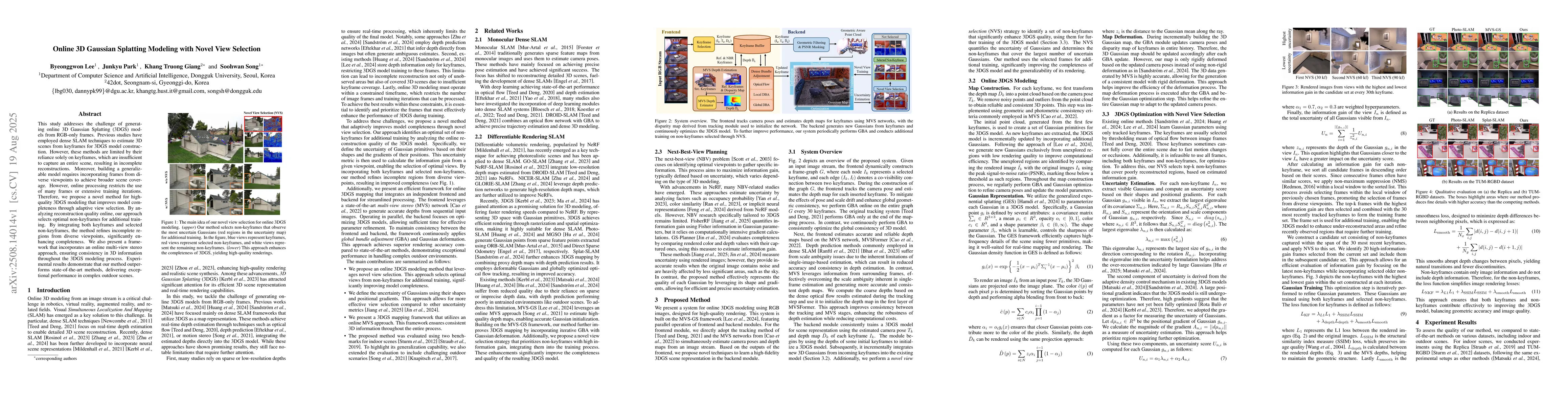 This study addresses the challenge of generating online 3D Gaussian Splatting (3DGS) models from RGB-only frames. Previous studies have employed dense SLAM techniques to estimate 3D scenes from keyframes for 3DGS model construction. However, these methods are limited by their reliance solely on keyframes, which are insufficient to capture an entire scene, resulting in incomplete reconstructions. Moreover, building a generalizable model requires incorporating frames from diverse viewpoints to achieve broader scene coverage. However, online processing restricts the use of many frames or extensive training iterations. Therefore, we propose a novel method for high-quality 3DGS modeling that improves model completeness through adaptive view selection. By analyzing reconstruction quality online, our approach selects optimal non-keyframes for additional training. By integrating both keyframes and selected non-keyframes, the method refines incomplete regions from diverse viewpoints, significantly enhancing completeness. We also present a framework that incorporates an online multi-view stereo approach, ensuring consistency in 3D information throughout the 3DGS modeling process. Experimental results demonstrate that our method outperforms state-of-the-art methods, delivering exceptional performance in complex outdoor scenes.