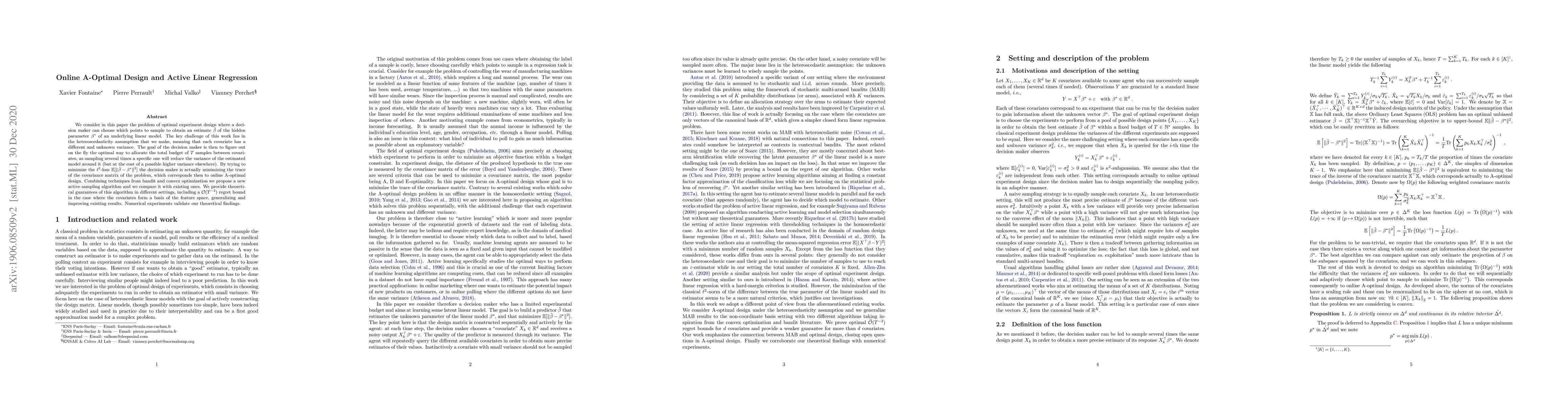 We consider in this paper the problem of optimal experiment design where a decision maker can choose which points to sample to obtain an estimate $\hat{\beta}$ of the hidden parameter $\beta^{\star}$ of an underlying linear model. The key challenge of this work lies in the heteroscedasticity assumption that we make, meaning that each covariate has a different and unknown variance. The goal of the decision maker is then to figure out on the fly the optimal way to allocate the total budget of $T$ samples between covariates, as sampling several times a specific one will reduce the variance of the estimated model around it (but at the cost of a possible higher variance elsewhere). By trying to minimize the $\ell^2$-loss $\mathbb{E} [\lVert\hat{\beta}-\beta^{\star}\rVert^2]$ the decision maker is actually minimizing the trace of the covariance matrix of the problem, which corresponds then to online A-optimal design. Combining techniques from bandit and convex optimization we propose a new active sampling algorithm and we compare it with existing ones. We provide theoretical guarantees of this algorithm in different settings, including a $\mathcal{O}(T^{-2})$ regret bound in the case where the covariates form a basis of the feature space, generalizing and improving existing results. Numerical experiments validate our theoretical findings.