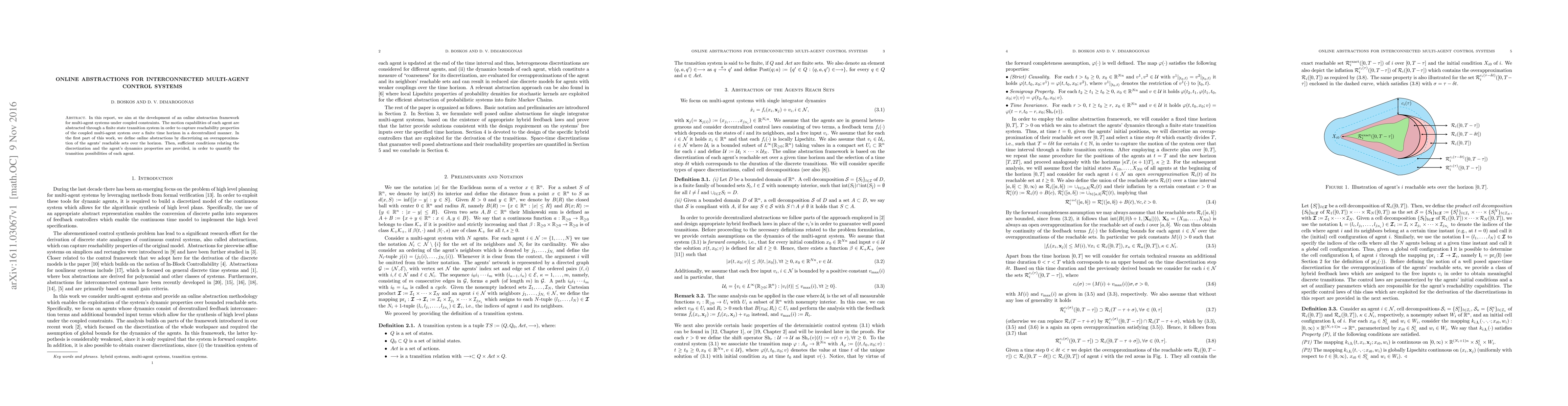 In this report, we aim at the development of an online abstraction framework for multi-agent systems under coupled constraints. The motion capabilities of each agent are abstracted through a finite state transition system in order to capture reachability properties of the coupled multi-agent system over a finite time horizon in a decentralized manner. In the first part of this work, we define online abstractions by discretizing an overapproximation of the agents' reachable sets over the horizon. Then, sufficient conditions relating the discretization and the agent's dynamics properties are provided, in order to quantify the transition possibilities of each agent.