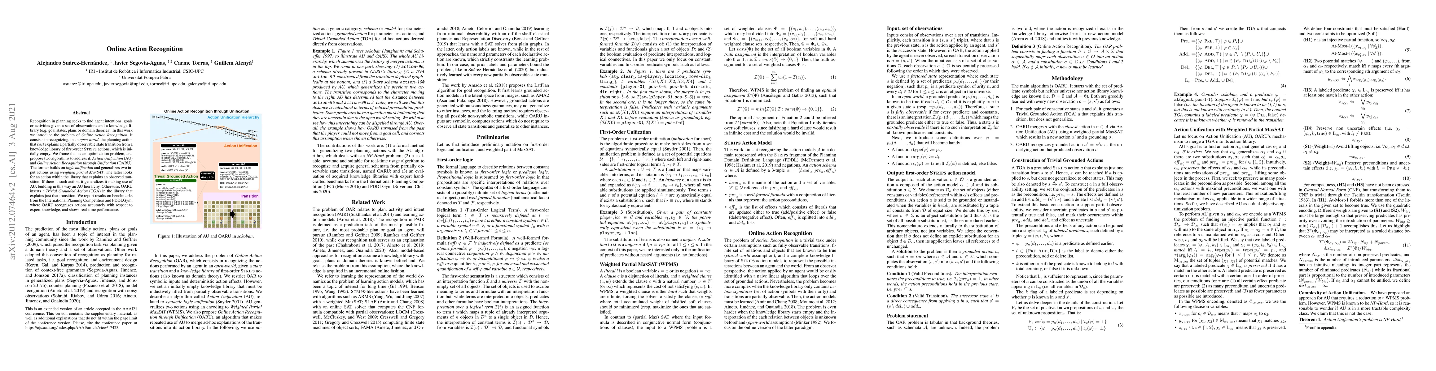 This paper introduces the problem of Online Action Recognition, proposing algorithms AU and OARU to recognize planning actions that explain state transitions in an open world. OARU either generalizes existing actions or inserts new ones, demonstrating accurate recognition and real-time performance on planning competition benchmarks.