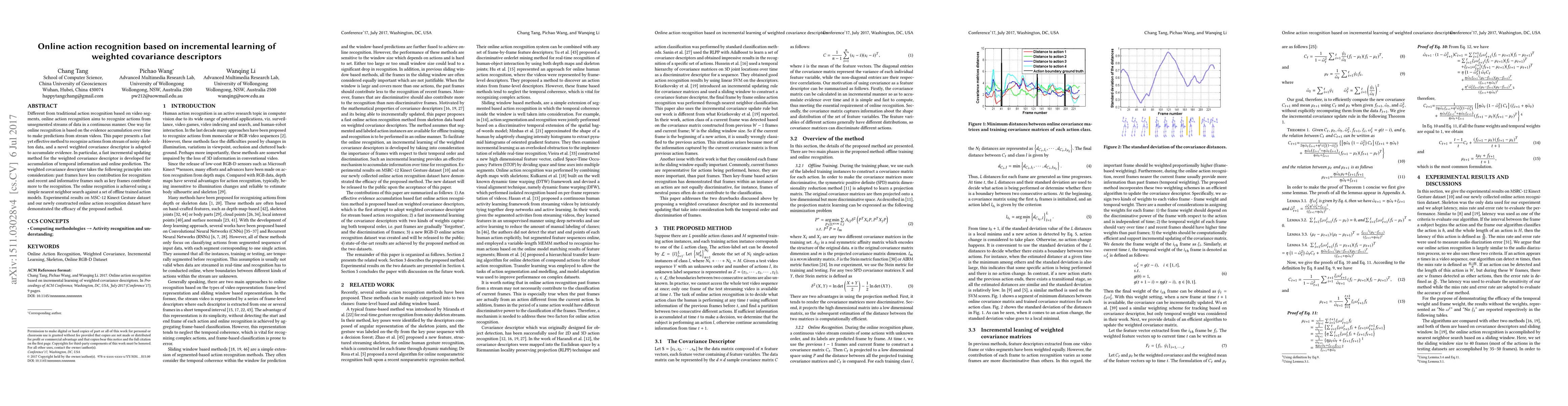 This paper presents a method for online action recognition using incremental learning of weighted covariance descriptors to process continuous streams of noisy skeleton data. The approach employs a fast updating method to accumulate temporal evidence and recognize actions in real-time, with recent frames weighted more heavily. Experimental results show the method's effectiveness on two datasets.