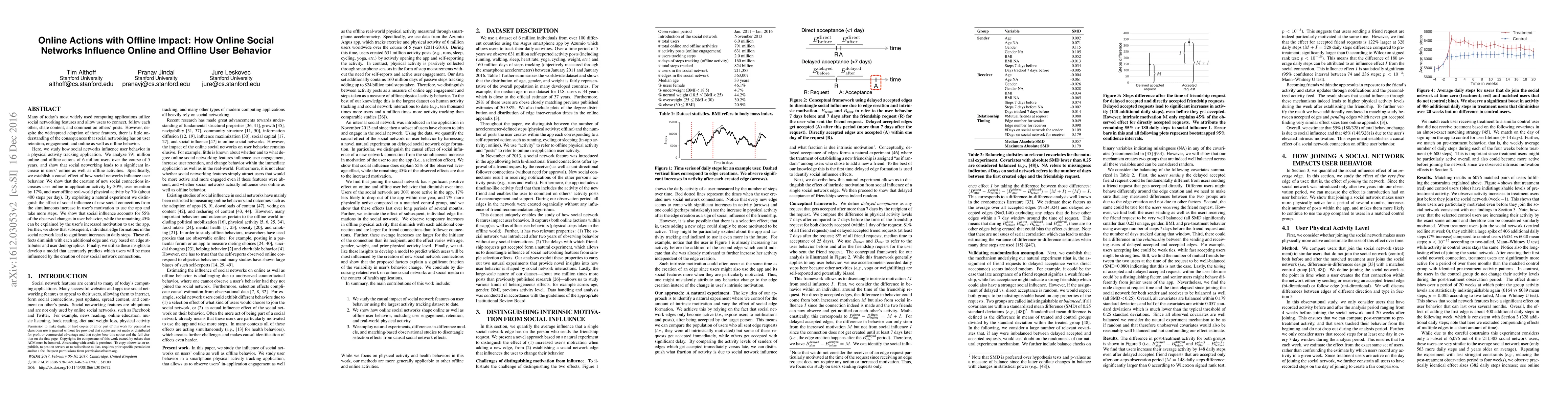 This study investigates how online social networks impact both online and offline user behavior in a physical activity tracking app, analyzing 791 million actions from 6 million users over five years. It finds that new social connections significantly boost online activity, retention, and offline physical activity, with social influence accounting for 55% of the behavioral changes.