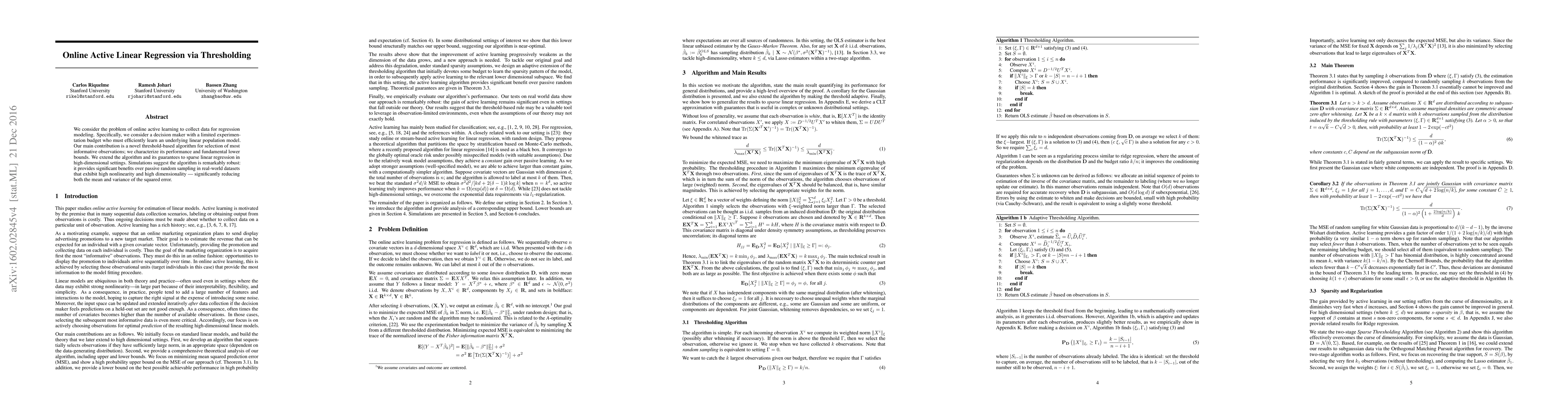 We consider the problem of online active learning to collect data for regression modeling. Specifically, we consider a decision maker with a limited experimentation budget who must efficiently learn an underlying linear population model. Our main contribution is a novel threshold-based algorithm for selection of most informative observations; we characterize its performance and fundamental lower bounds. We extend the algorithm and its guarantees to sparse linear regression in high-dimensional settings. Simulations suggest the algorithm is remarkably robust: it provides significant benefits over passive random sampling in real-world datasets that exhibit high nonlinearity and high dimensionality --- significantly reducing both the mean and variance of the squared error.