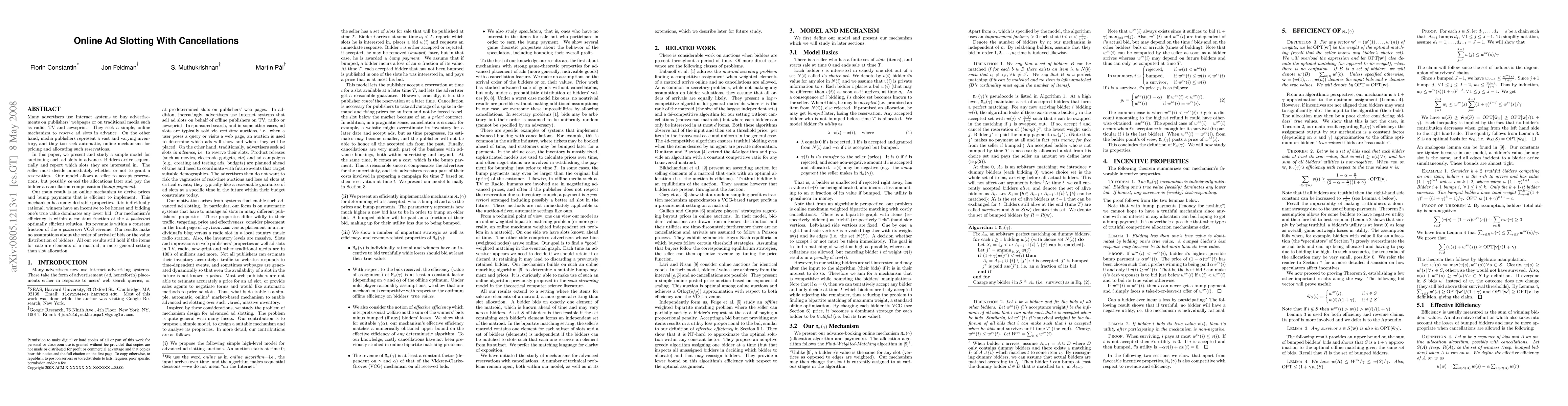 Many advertisers buy advertisements (ads) on the Internet or on traditional media and seek simple, online mechanisms to reserve ad slots in advance. Media publishers represent a vast and varying inventory, and they too seek automatic, online mechanisms for pricing and allocating such reservations. In this paper, we present and study a simple model for auctioning such ad slots in advance. Bidders arrive sequentially and report which slots they are interested in. The seller must decide immediately whether or not to grant a reservation. Our model allows a seller to accept reservations, but possibly cancel the allocations later and pay the bidder a cancellation compensation (bump payment). Our main result is an online mechanism to derive prices and bump payments that is efficient to implement. This mechanism has many desirable properties. It is individually rational; winners have an incentive to be honest and bidding one's true value dominates any lower bid. Our mechanism's efficiency is within a constant fraction of the a posteriori optimally efficient solution. Its revenue is within a constant fraction of the a posteriori revenue of the Vickrey-Clarke-Groves mechanism. Our results make no assumptions about the order of arrival of bids or the value distribution of bidders and still hold if the items for sale are elements of a matroid, a more general setting than slot allocation.