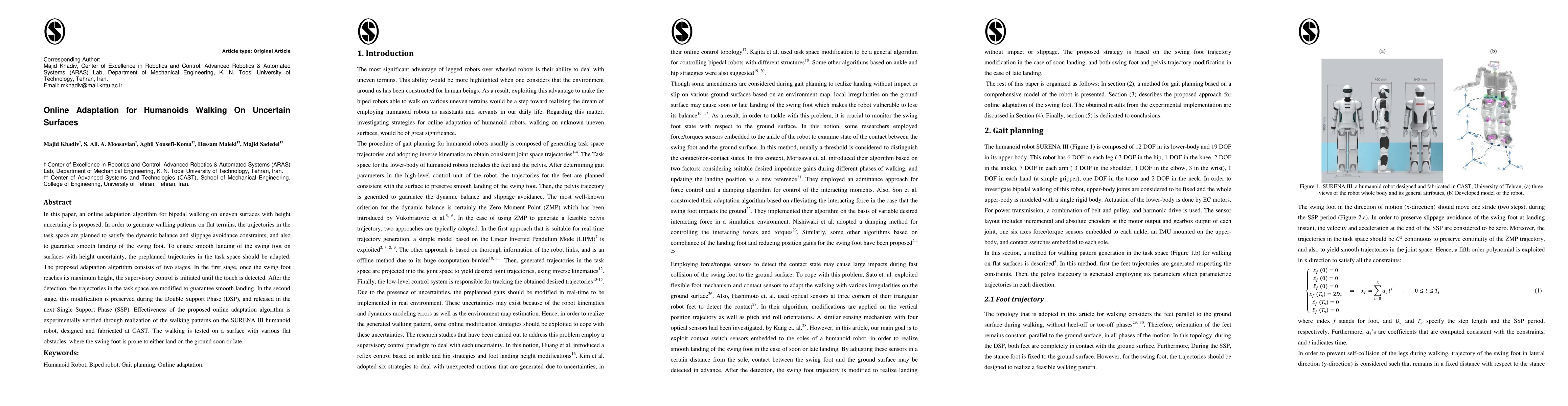 In this paper, an online adaptation algorithm for bipedal walking on uneven surfaces with height uncertainty is proposed. In order to generate walking patterns on flat terrains, the trajectories in the task space are planned to satisfy the dynamic balance and slippage avoidance constraints, and also to guarantee smooth landing of the swing foot. To ensure smooth landing of the swing foot on surfaces with height uncertainty, the preplanned trajectories in the task space should be adapted. The proposed adaptation algorithm consists of two stages. In the first stage, once the swing foot reaches its maximum height, the supervisory control is initiated until the touch is detected. After the detection, the trajectories in the task space are modified to guarantee smooth landing. In the second stage, this modification is preserved during the Double Support Phase (DSP), and released in the next Single Support Phase (SSP). Effectiveness of the proposed online adaptation algorithm is experimentally verified through realization of the walking patterns on the SURENA III humanoid robot, designed and fabricated at CAST. The walking is tested on a surface with various flat obstacles, where the swing foot is prone to either land on the ground soon or late.