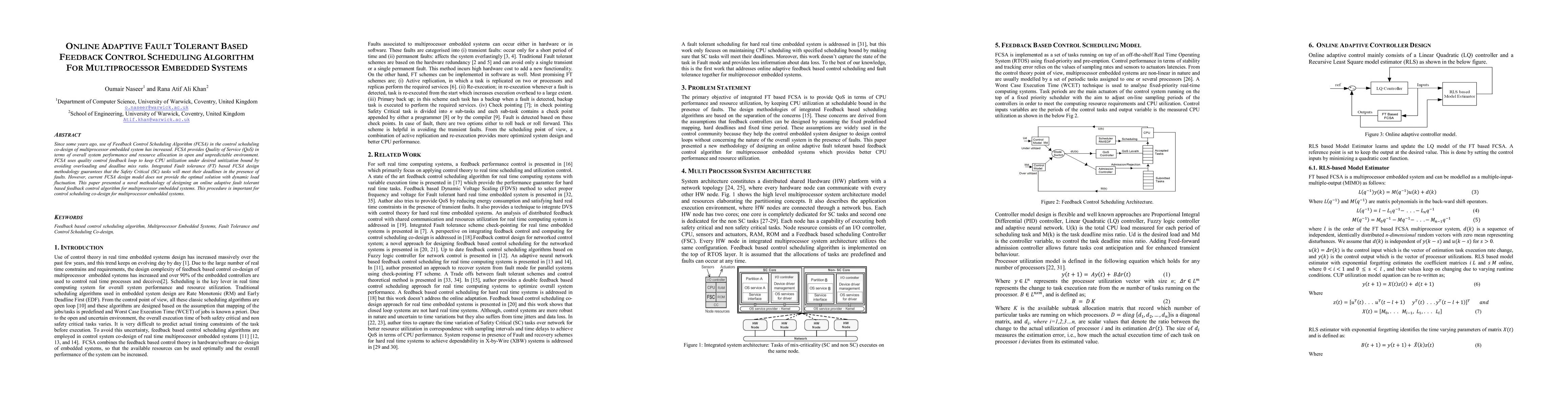 This paper proposes an online adaptive fault tolerant feedback control scheduling algorithm for multiprocessor embedded systems to optimize performance and resource allocation under dynamic load conditions, ensuring safety critical tasks meet deadlines despite faults. The methodology aims to enhance the existing Feedback Control Scheduling Algorithm (FCSA) for better fault tolerance and dynamic adaptability.