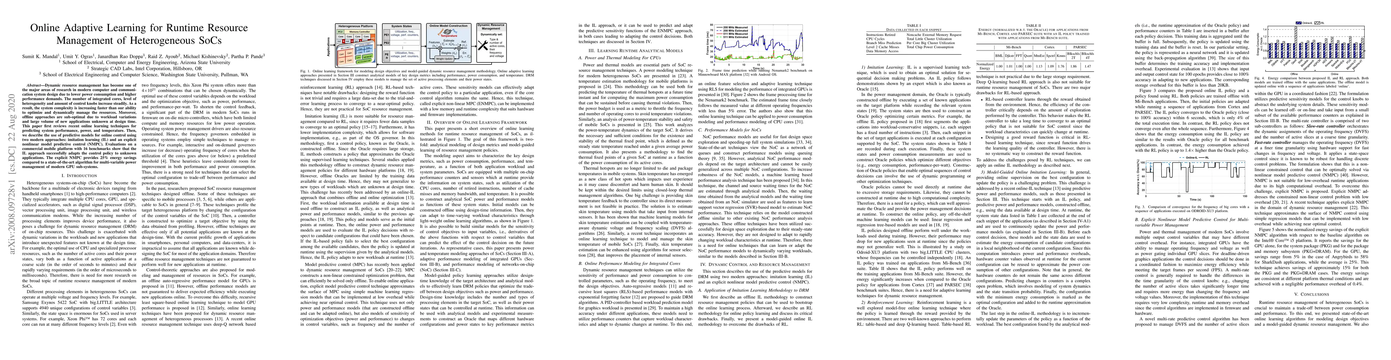 A study explores online adaptive learning for optimizing runtime resource management on heterogeneous SoCs, achieving 25% energy savings in GPU subsystems with an NMPC approach.