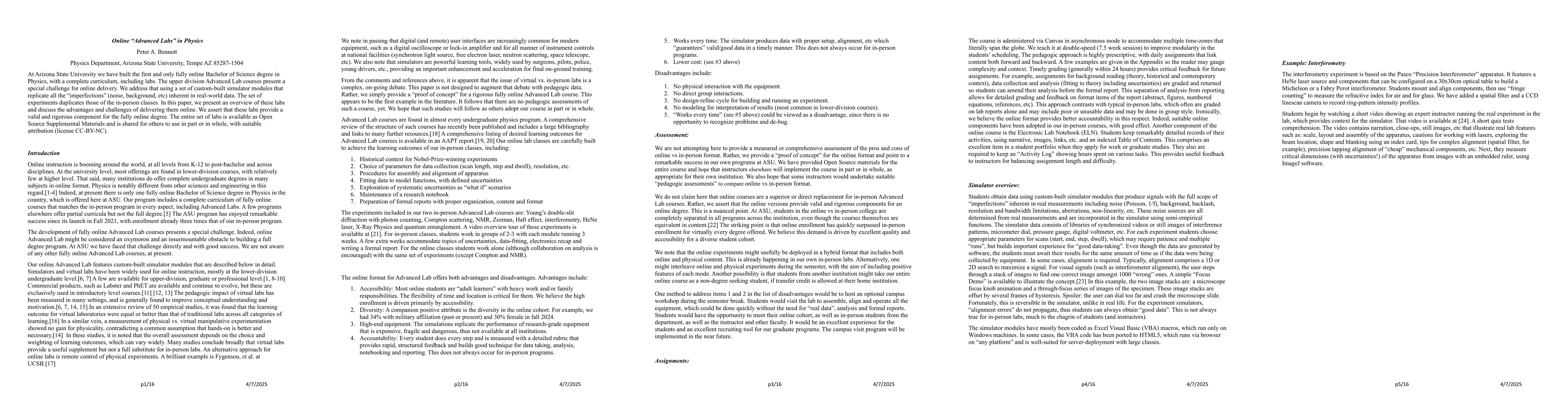 Arizona State University developed a fully online Bachelor of Science degree in Physics, incorporating custom-built simulator modules for upper-division Advanced Lab courses to replicate real-world data imperfections.